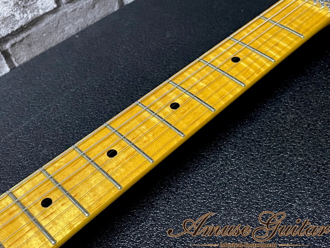 こちらのスペックはボディには厳しく選定されたアッシュ材を採用、剛性の優れたハードメイプル(板目)のネックに、素晴らしいフィギュアドの杢目かつフレックラインも確認できる極上のフレイムメイプルを指板に使用した木材マテリアル。ボルトオン構造ではございますが、ネックエンド部がフロントピックアップ下まで伸びたディープインサート方式を採用する事により、まるでセットネックの様なサスティーンと、ボルトオン構造独特の発音の良い歯切れが非常に心地よく唯一無二のサウンドバランスを誇ります。ネックシェイプはローポジションのVからハイポジションに向かい徐々にUシェイプになるこだわりの設計。ボディトップ面に角度を持たせた【アングルド・ボディ・トップ】を採用しており、他のギターでは体験できない演奏時のフィット感/ストレスの無さも大きな特徴の一つです。その他としましてはESP Random Star等にも採用されておりますSchaller M6 MINIペグを5:1にて搭載。ボディ裏ジャック部分はエンドピンにシールドをかけられ、演奏の邪魔にもなりにくい位置に計算された角度となっています。その他としてはヴォリュームノブはPUSH-PULLのPOTとなり、ON時はコイルタップ機能が楽しめます。