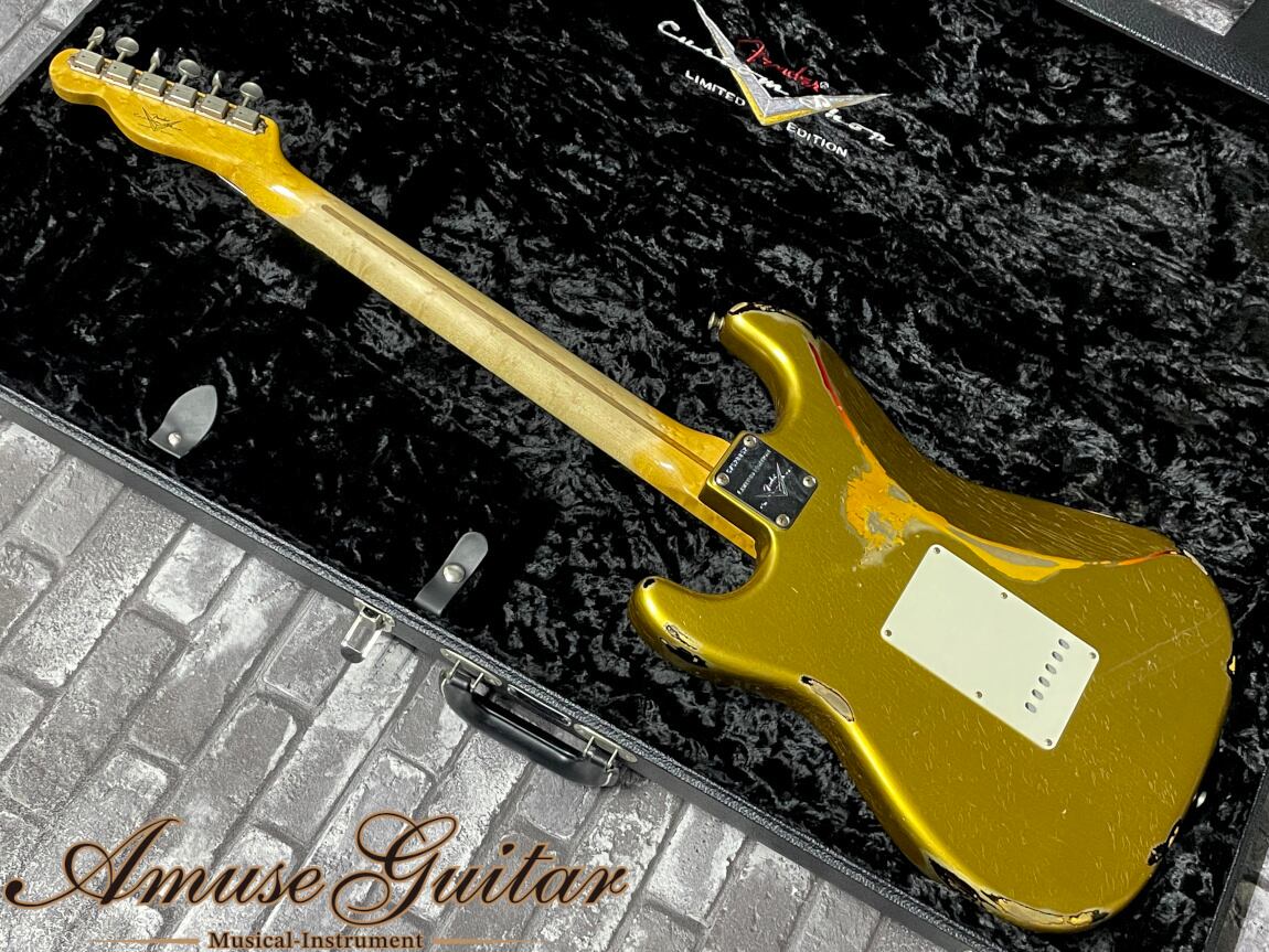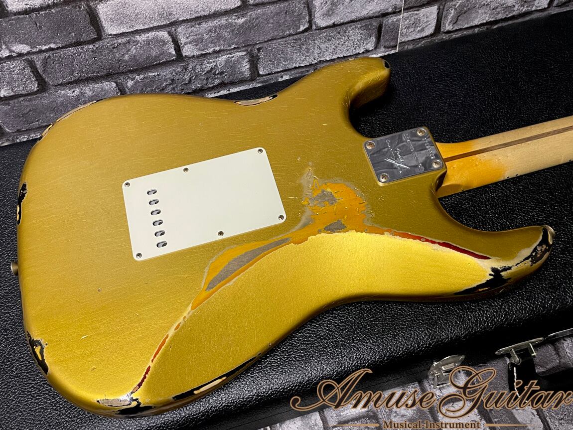 今回ご紹介させていただきますのは、そのミスチフメーカーのカスタムショップ製の一本。圧巻のヘヴィ・レリックが素晴らしく、マルチレイヤーにてゴールドと、サンバーストを組み合わせた唯一無二のルックスに仕上げられています。珍しい逸品で気合の入ったクオリティという事に加え、使用感も少ない個体となっており、今後お目にかかれないであろう個性派かつ非常にオススメの一本です。