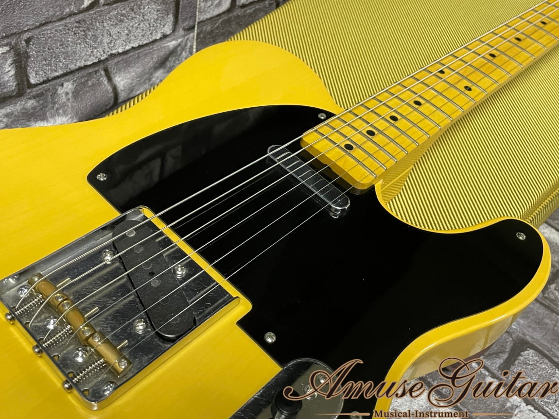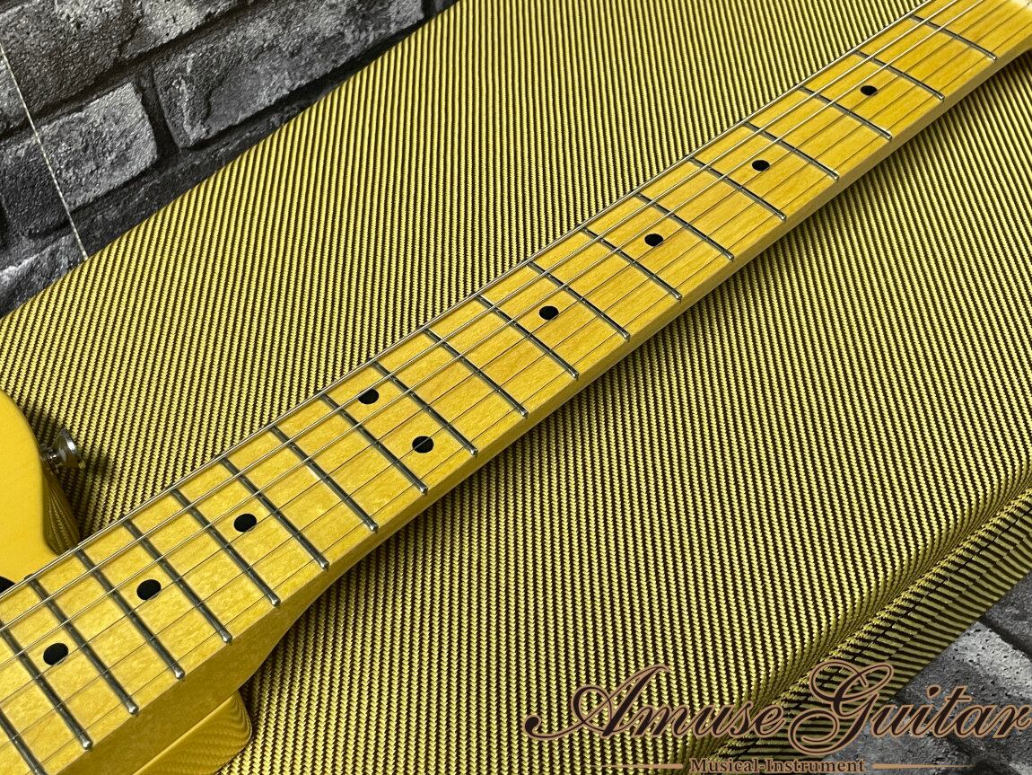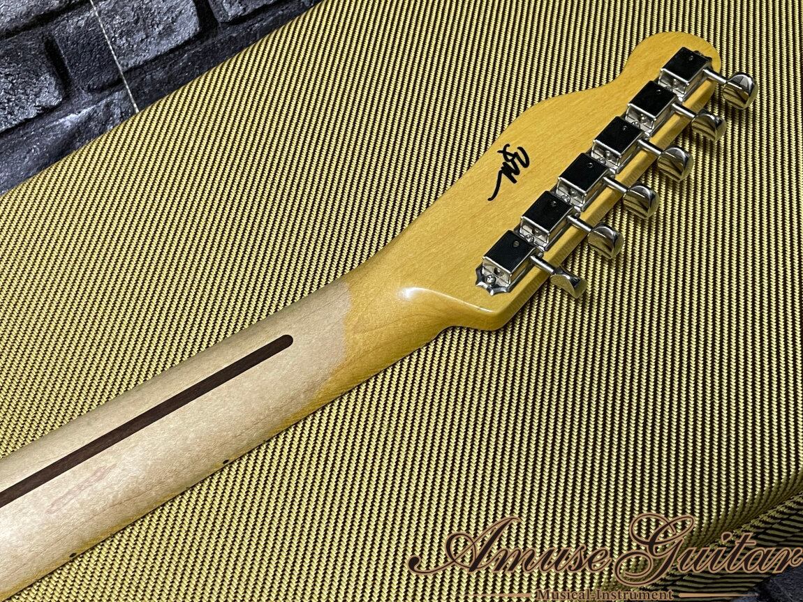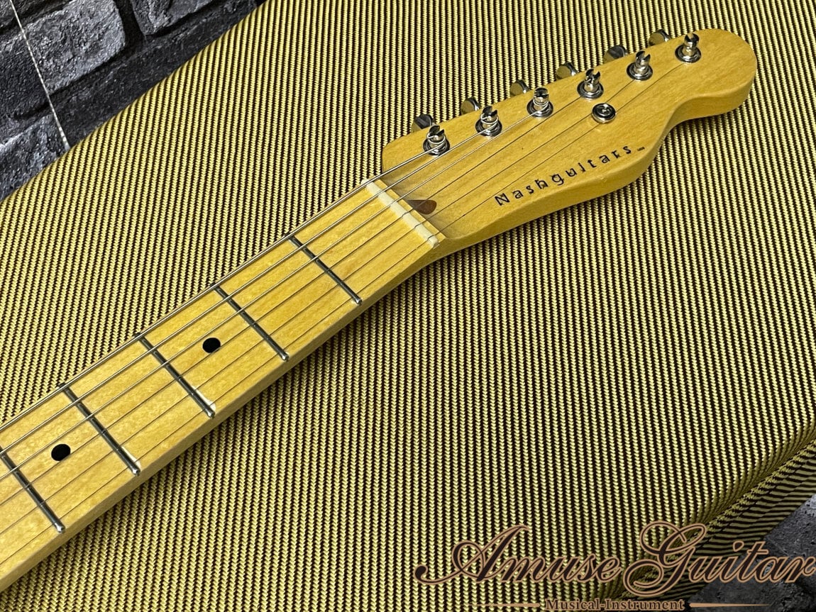 まずスペックとしては、約3.1kgと非常に軽量な厳選されたアッシュボディに、存在感のあるバタースコッチブロンドフィニッシュ。ピックガードはもちろんブラックガード。ネックはヴィンテージによく見られるサウンド重視のフラットソーン1ピースメイプルを採用。そしてNash Guitarsのお家芸とも言われるエイジド加工にも特に力が入っております。実際にアーティストが長年大事に使用していた様なレリックが非常にリアルで、ボディだけでなく、ネックバックを弾き込む事で塗装がサテン調になる部分やヘッド、細かなパーツに至るまで本当に拘っており、とても近年物とは思えない極上のヴィンテージルックスとなっております。