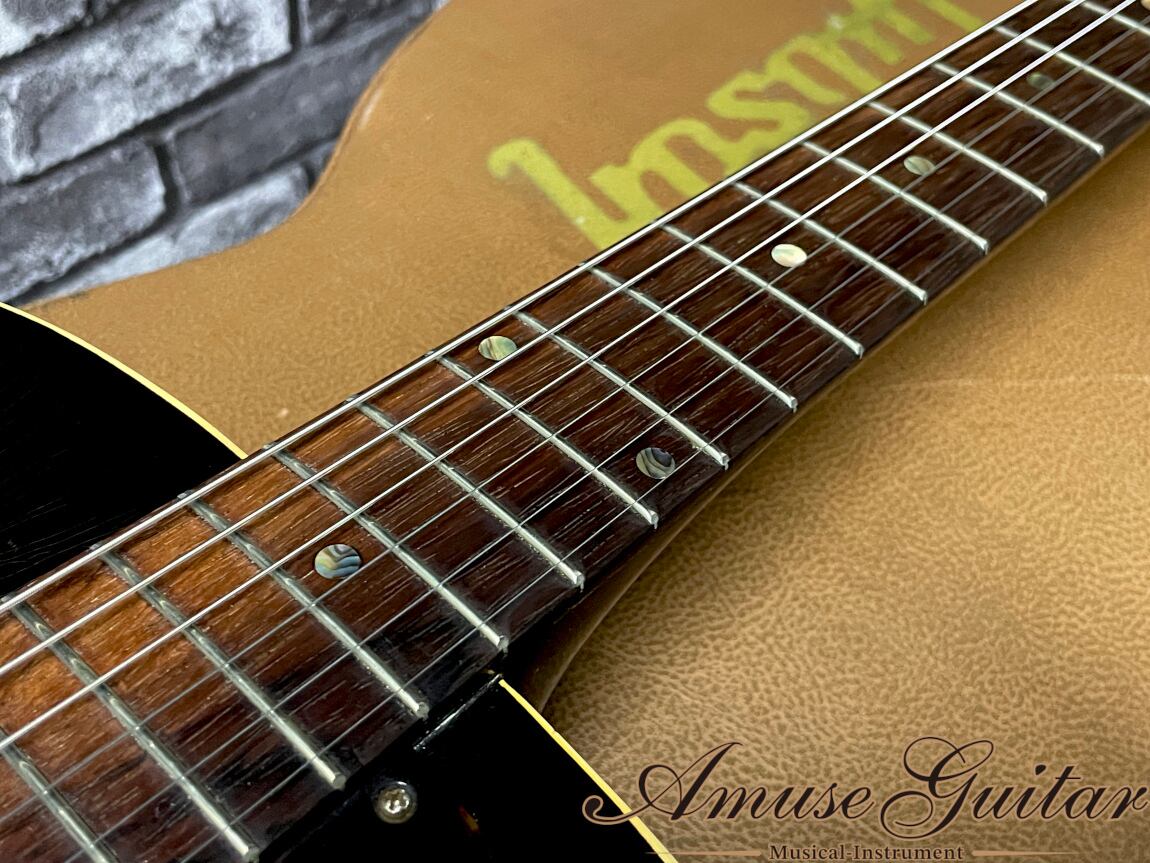 コンディションに至っては現在までに68年と、ゆうに半世紀を超える歳月が経過しているだけあって、各所にビッシリと入ったウェザーチェッキング、数々のミュージックシーンを過ごした使用感こそ見受けられるものの、こういった”本物”のルックスこそがヴィンテージファンを惹きつけるのも事実です。またパーツ類に至ってはペグ、ピックアップ、ポット(55,56デイト)、テイルピースなどの消耗品やピックアップといった主要パーツはオリジナルをキープ。変更点としてはフレット&ナット、ビス、ピックガードブラケットとなっております。プレイ面に関してはネックコンディションは良好でトラスもしっかりと余裕が残っております。フレットは元々背の高いタイプではありませんが、現状にて大きな凹みも無く7部山といったところでまだまだ使えます。ケースはGibson製のブラウンハードケースが付属致します。