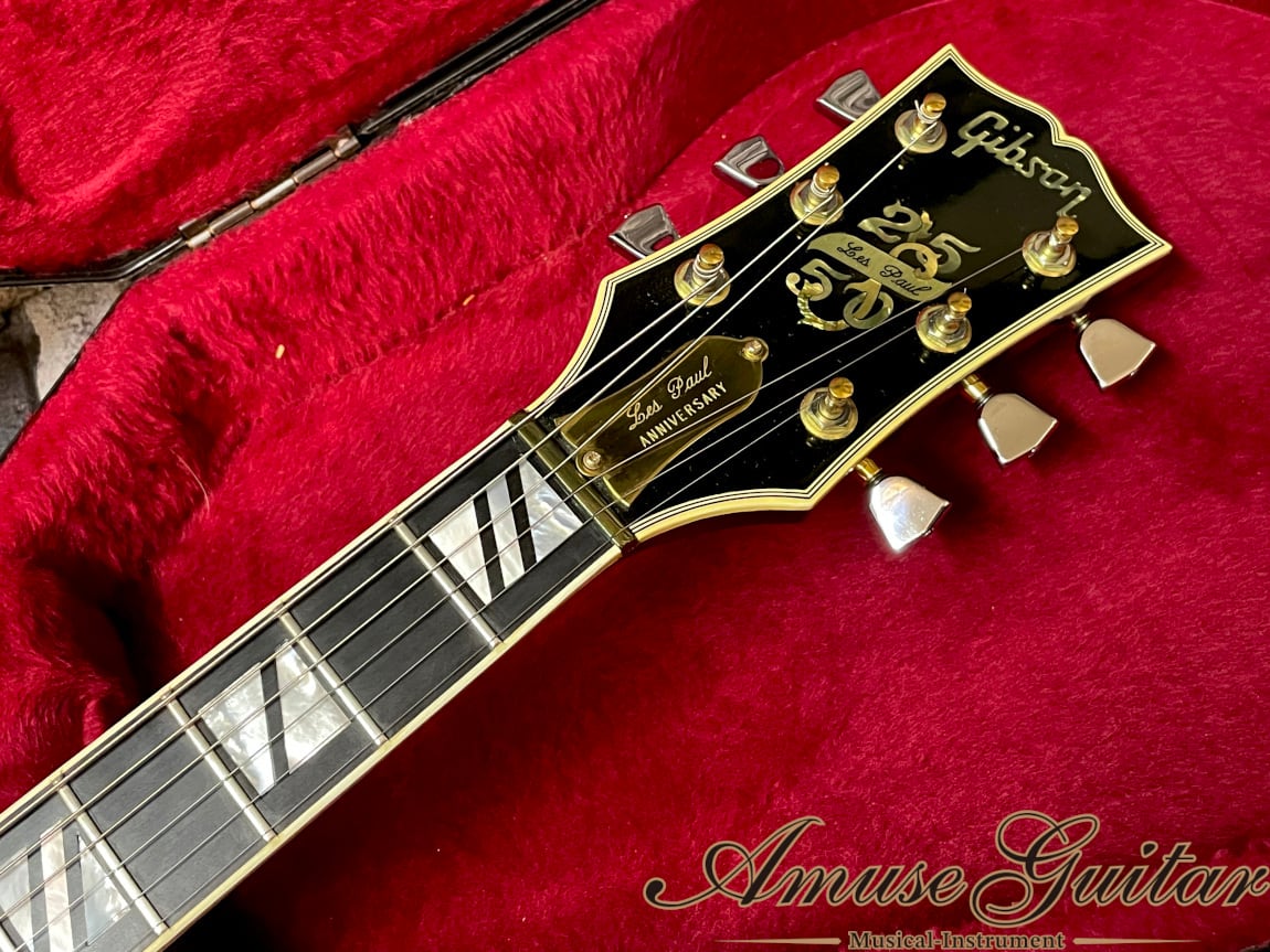 今回ご紹介させていただきますのは、そのレスポールモデルの中でも限定モデルとして1978~1979年に製作された非常に希少なモデル“25/50 Anniversary”です。レス・ポール発売25周年とレス・ポール氏の音楽活動50周年を記念して発売された限定生産モデルとなっており、通常モデルとは異なるゴージャスで、ハイエンドなスペックが特徴。生産本数が少ないことも加え、近年では高騰が目立つ人気の機種です。Neal Schonが70~80年代に愛用していた”Les Paul Super Custom”にも通ずるスペシャルなスペックは、全ギタリストの憧れです。そんなプレミアムなアイテムなだけでも素晴らしいのですが、こちらの前所有者様が新品購入後ほとんど使用されず、保管状態等も丁寧に管理され、交換パーツもないフルオリジナル状態の奇跡的コンディションをキープしたミュージアムレベルの逸品です。