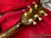こちらのスペックですが、ボディトップにはフィギュアド(フレイム)メイプル、ボディバックには1Pのマホガニー、また3Pのネックにはこれまた美しい強烈なフレイムメイプルを採用。その他杢目の詰まった漆黒のエボニー指板にSuper-400同様のスラッシュド・ブロックインレイ、”25/50 Les paul”の特別なヘッドインレイに、ゴールド&シルバーのコンビネーションキーストーンチューナー、ゴールドパーツ、リアのPUはオリジナルでオープンドになります。またブラス製のトラスロッドカバーには”Les Paul ANNIVERSARY”のロゴが入ります。その他としてはペグヘッド裏に通常シリアル・ナンバーと限定ナンバーのダブルシリアル、テイルピースにはファインチューナーが搭載されたTP-6、バレルノブ(スピードノブ)、ピンスイッチによるコイルタップ機能、コントロール内部には弁当箱型ノイズシールド搭載などが挙げられます。