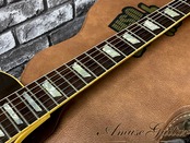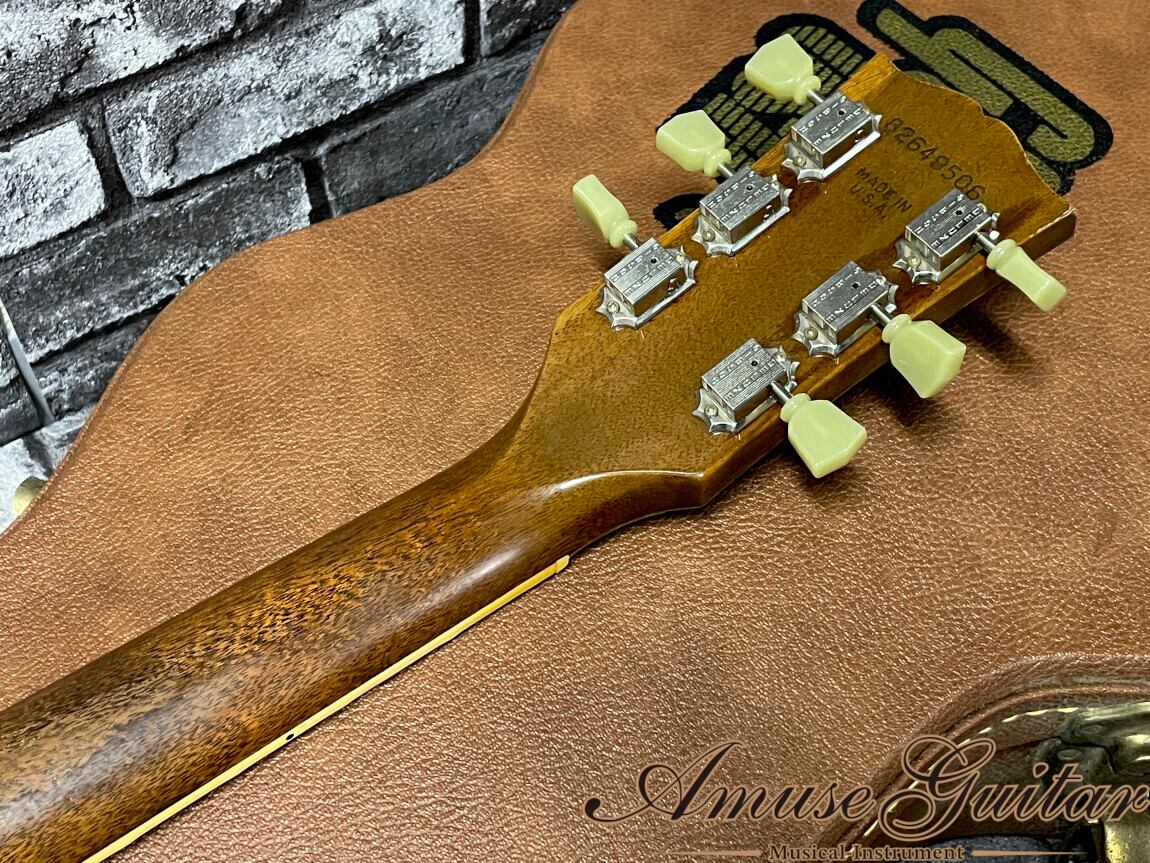 コチラのスペックですが、ボディには薄っすらとフィギュアド杢目も確認できる2Pメイプルトップに、バックは1Pマホガニーのボディ。ネックにはマホガニーと、まるでエボニーの様な黒々とした目の詰まったローズウッド指板の木材マテリアルで、セットネック構造のレスポール然とした基本構成。フィニッシュはヴィンテージサンバースト(タバコバースト)で、引き締まった印象がクールなカラーです。ネックシェイプは、適度に薄さを持たせたプレイアビリティの高い素晴らしいプロファイルとなっております。その他としてはラージヘッド、”GIBSON DELUXE”刻印のクルーソンペグ(換装)、ナッシュビルタイプのチューン・O・マチック&ダイキャスト製テイルピースのブリッジ、2ヴォリューム/2トーンのコントロール、スピードノブ(バレルノブ)、金属製ジャックプレート等が挙げられます。