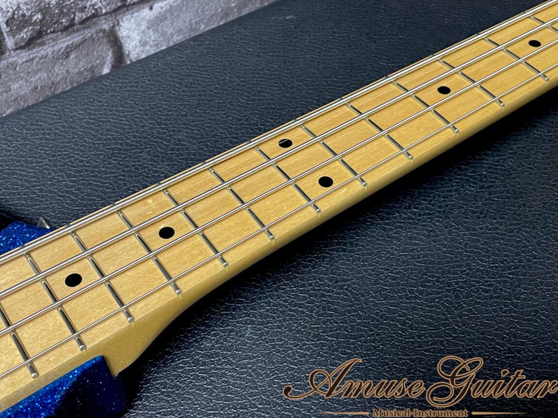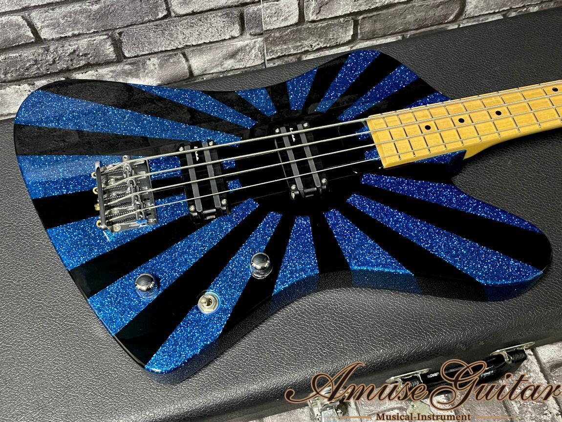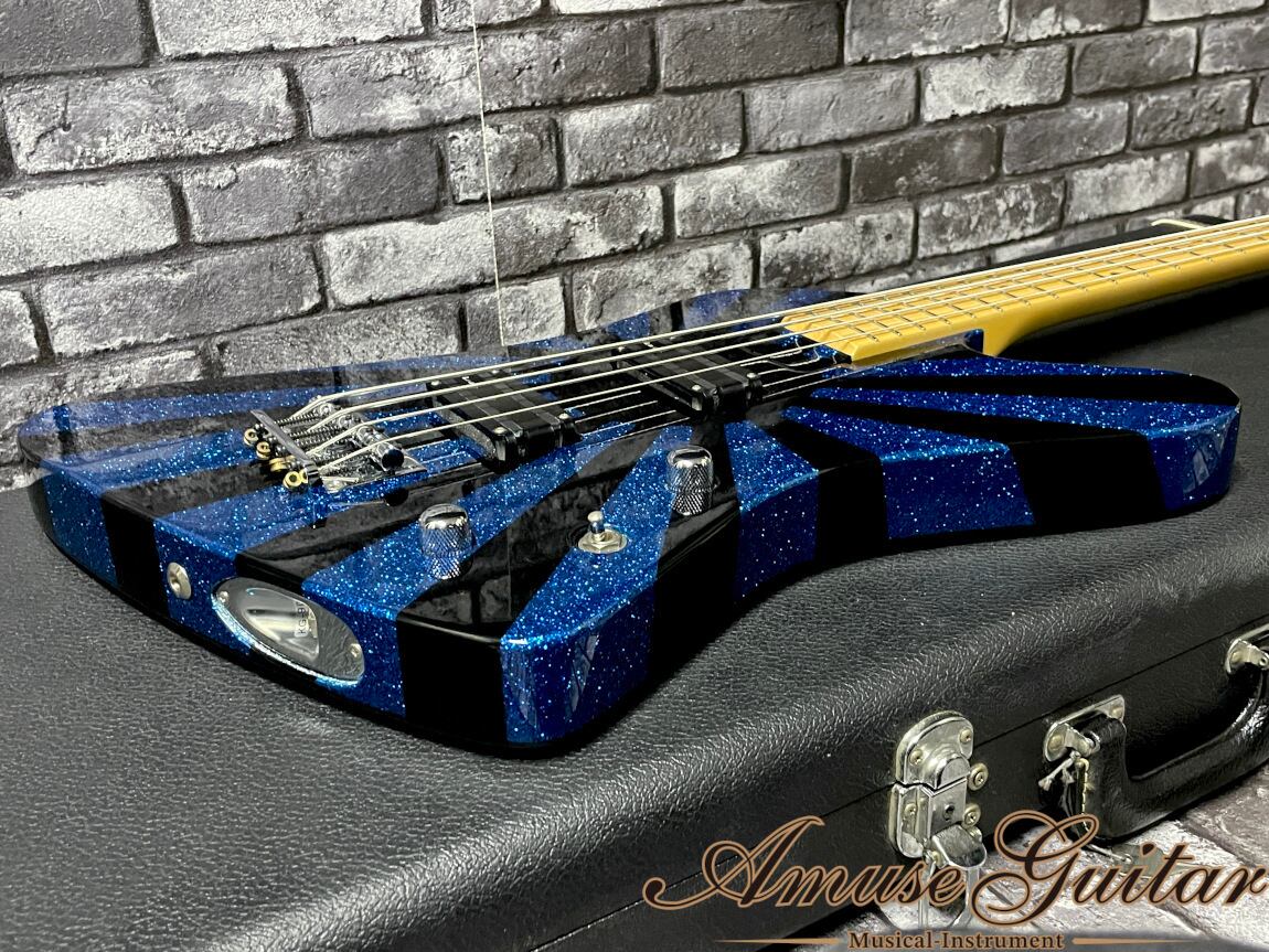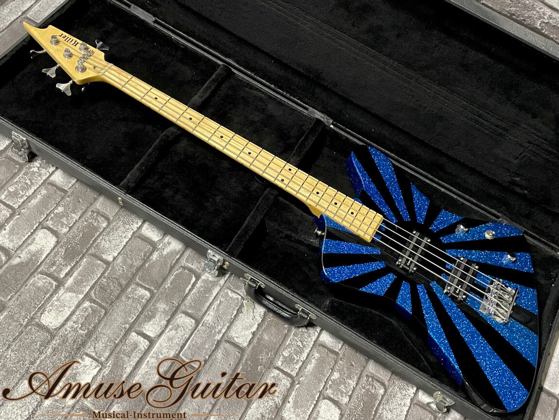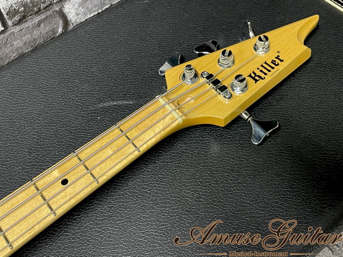 こちらのスペックは、アッシュバック/ハードメイプルトップのボディ、メイプル貼り指板のメイプルネック(板目)の木材マテリアル。ロングスケール、21フレットのボルトオン構造。ジョイント部には【Deep Insert Joint】を採用。KG-Prime等にも採用されたKiller社を代表する機構で、ネックとボディの接地面を広く取り、セットネック構造の様な一体感のある鳴りと、ボルトオン構造の立ち上がりの良さの両立を実現。ボディフィニッシュにはグリッターラメのブルーの部分と、ブラック塗装のコントラストが唯一無二のBlack Sun。ボディバックは演奏面にも考慮したサテン仕上げのブラック。ヘッドストックはKillerオリジナル3:1のヘッドストック、ストリングリテイナー(ガイド)には軽量なヒップショット製、4弦のペグにはヒップショット・エクステンダーを搭載し、ドロップチューニングを瞬時の操作にて変更可能。ネックサイドポジションには大きめの蓄光素材を採用し、ステージでの視認性も抜群。ストラップピン×2にはダンロップ製Straplokを採用し、アタッチメントジョイント&埋め込みにてボディバランスを考慮した配置となります。