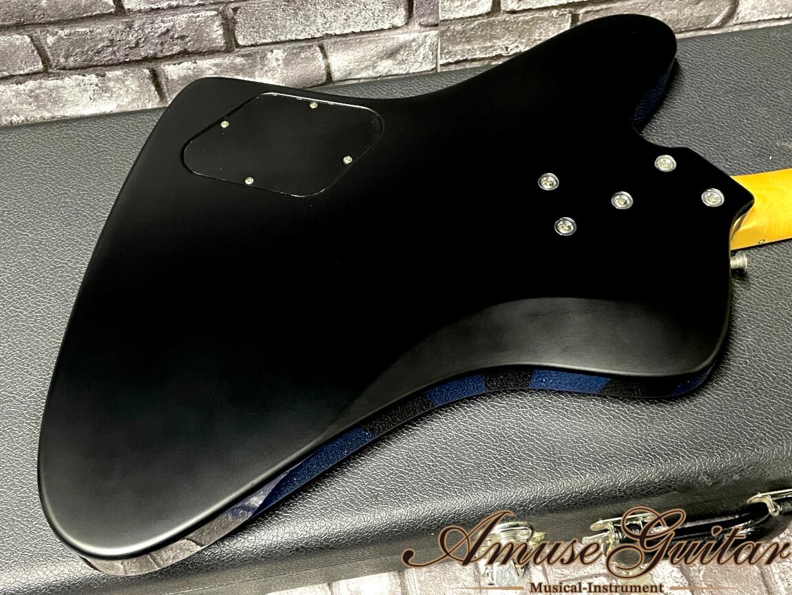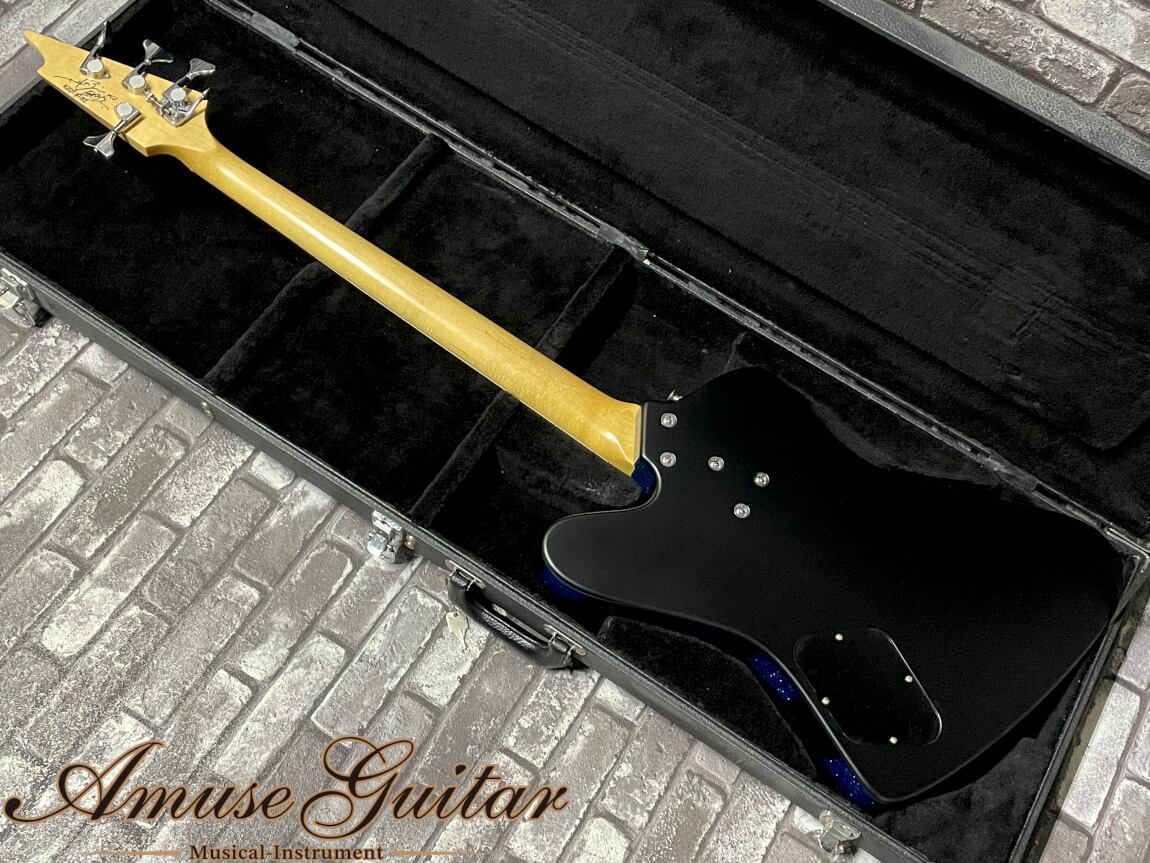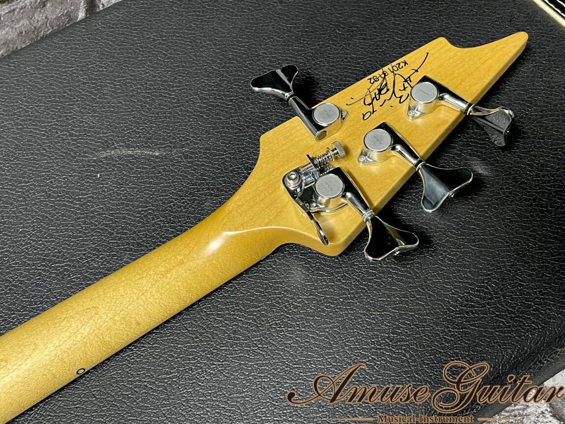 今回ご紹介させていただきますのは、そのキラーのKB-DUBIOUS です。2000年に結成し、国内はもとより海外でもムーブメントを起こすヴィジュアル系ロックバンド“ナイトメア”にて結成時よりベースを担当するNi~ya氏のシグネイチャーモデルとなります。Gibson Thunderbirdにインスパイアされた変形シェイプをKiller独自のデザイン、機構を盛り込み、サウンド/演奏の両面にて素晴らしい仕上がりを実現した逸品です。中古市場でもめったにお目にかかれないレアカラー&美品コンディション、更には通常ではありえないヘッド裏にNi~ya氏本人のサインもされたプレミアムな一本です。