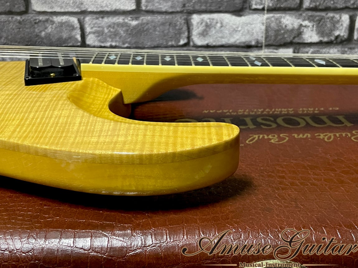 今回ご紹介させていただきますのは、フィルモアからリリースされた一本。輸入代理店としてモズライトを国内に卸していたフィルモアが、モズライト日本販売より40周年記念として発表した特別なノーキー・エドワーズモデルです。ノーキーが愛用していたHitchhiker製のギタースペックをモズライトに盛り込んだスペシャルスペック。極厚のAAAカーリーメイプルを採用した当時の最高峰の仕上がりです。ただでさえ珍しいモデルですが、今回入荷個体は工場出荷オリジナル状態から特別なスペックが追加された激レア品です。