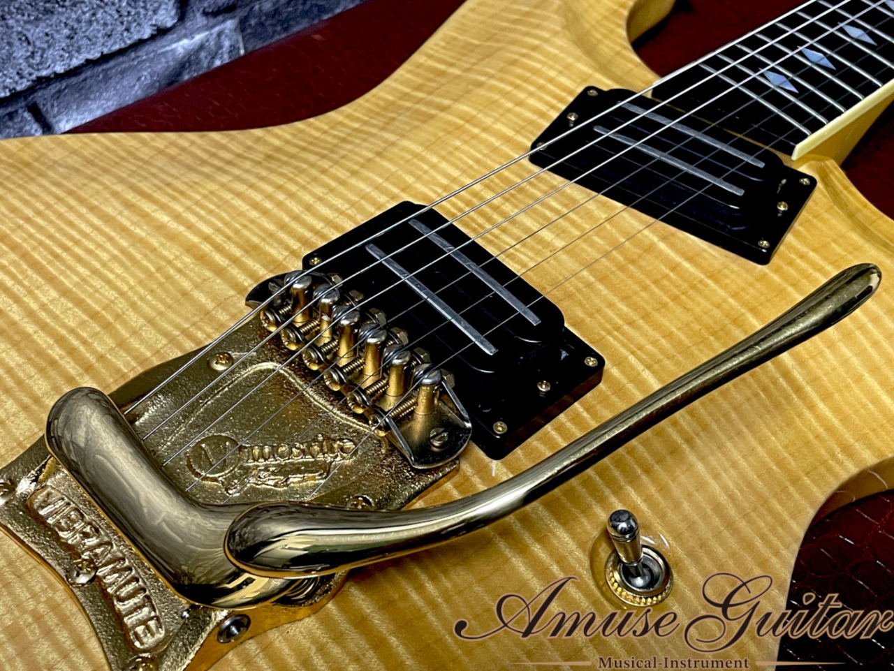 こちらのスペックですが、まず目に飛び込むのはそのゴージャスな杢目のAAAグレードのカーリーメイプル(フィギュアドフレイムメイプル)。贅沢にも分厚くボディトップに採用されており、それに合わせてボディバックの2Pメイプルもフィギュアドの杢目が素晴らしい厳選材を使用。ネックにもうっすらとフィギュアドが確認できるハードメイプルに、真っ黒で木目の詰まったエボニー。ヘッドトップにもカリーメイプル(突板)を採用した木材マテリアルです。ゴールドにて統一されたパーツカラーも杢目にマッチングしており、自然でいやらしくない仕上がりです。ミディアムスケールのボルトオン構造。39mmナット、0フレット&ストリングガイド(ブラスナット)、ダイヤモンドインレイ(メキシコ貝)、ローラーブリッジ(USA製)&ビブラメイトアームユニット等、モズライトには欠かせない仕様ももちろん採用。