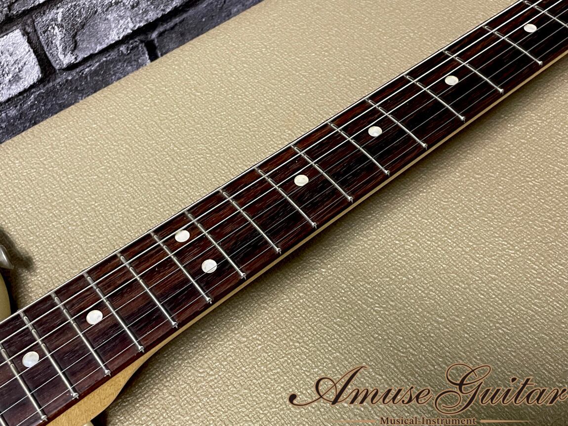 こちらのスペックですが、ボディに軽量のアッシュ1P、ネックには板目取りのメイプル、指板はラウンド貼りとなるブラウンのコントラストが色濃く出たローズウッドの木材マテリアルです。ボルトオン仕様のロングスケール。その他はフェンダーテレキャスター然とした仕様となっており、8点止め3Pのホワイトガード、スチール "バレル "ブリッジ・サドル、クルーソンチューナー、パールドットポジションマーク、比較的細めで握りやすい“Mid '60s "C"”シェイプ、ヴィンテージスタイルフレットの21F仕様、指板ラディアスは7.25Rとクラシックな仕上がりです。