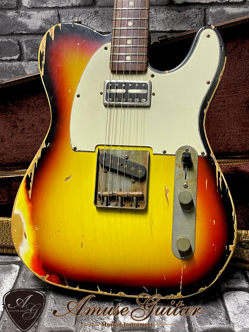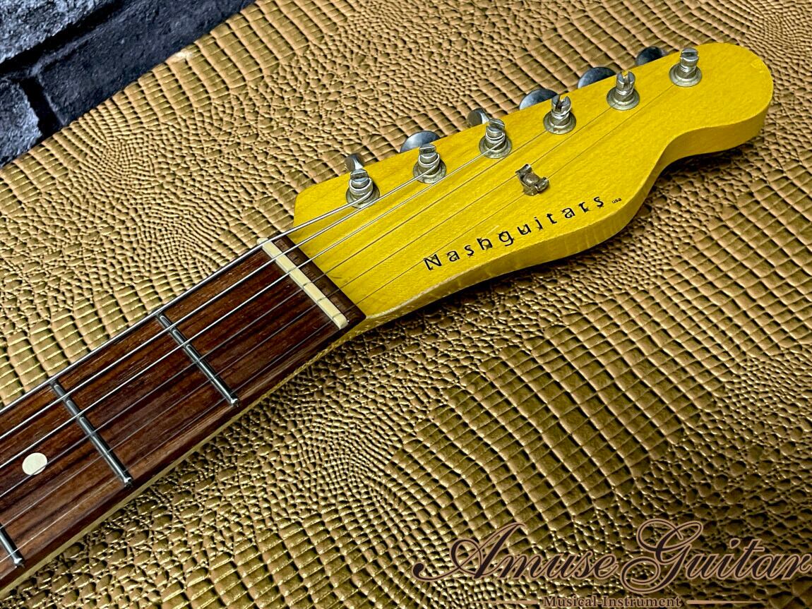 今回ご紹介させていただきますのは、そのナッシュギターズにて製作された63年モチーフのテレキャスタータイプの一本です。HSのピックアップレイアウトにて、フィニッシュ、パーツを全てヘビーエイジング加工された圧倒的なヴィンテージルックスに仕上げられております。加えて、ローラー製ピックアップ搭載にてギターそのもののサウンドも120%発揮された素晴らしい逸品です。