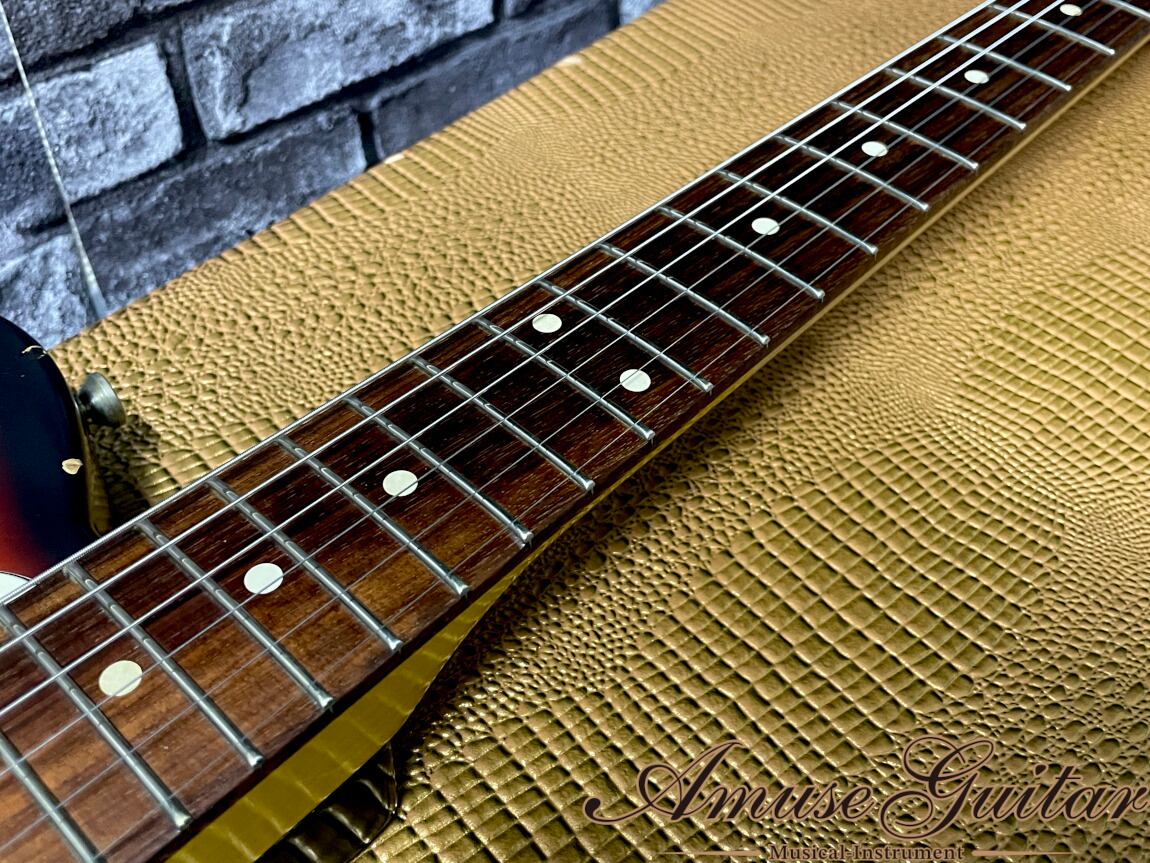 こちらのスペックとしては、ボディにはアルダー、ネックには追い柾目のメイプル、指板にはまるでハカランダの様なブラウンコントラストの強いローズウッドの厳選した木材マテリアルとなっており、王道かつ”間違いない”トラディショナルなチョイス。ボルトオン構造の、21フレット、ロングスケール、タスクナット、ミディアムジャンボタイプのフレット採用。ネック/ボディ/パーツの全てにナッシュの最大の特徴である技術度の高い圧巻のエイジング加工が施されており、まるでリアルに使用されてきたヴィンテージギターの様な風格とオーラが漂っています。細部パーツとしては、3Pピックガード、ブリッジには3コマのブラスサドル、クルーソンタイプチューナー、クレイドットインレイ等が挙げられます。内部電装パーツに関してもCRLセレクター、CTS POT、オレンジドロップキャパシターなどを採用し細部にまで抜かりがありません。