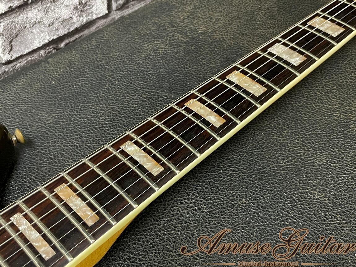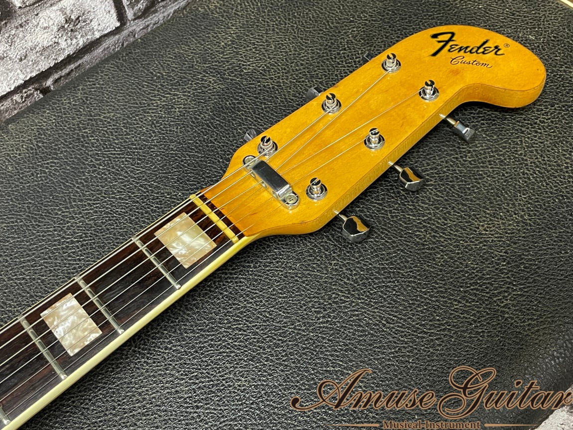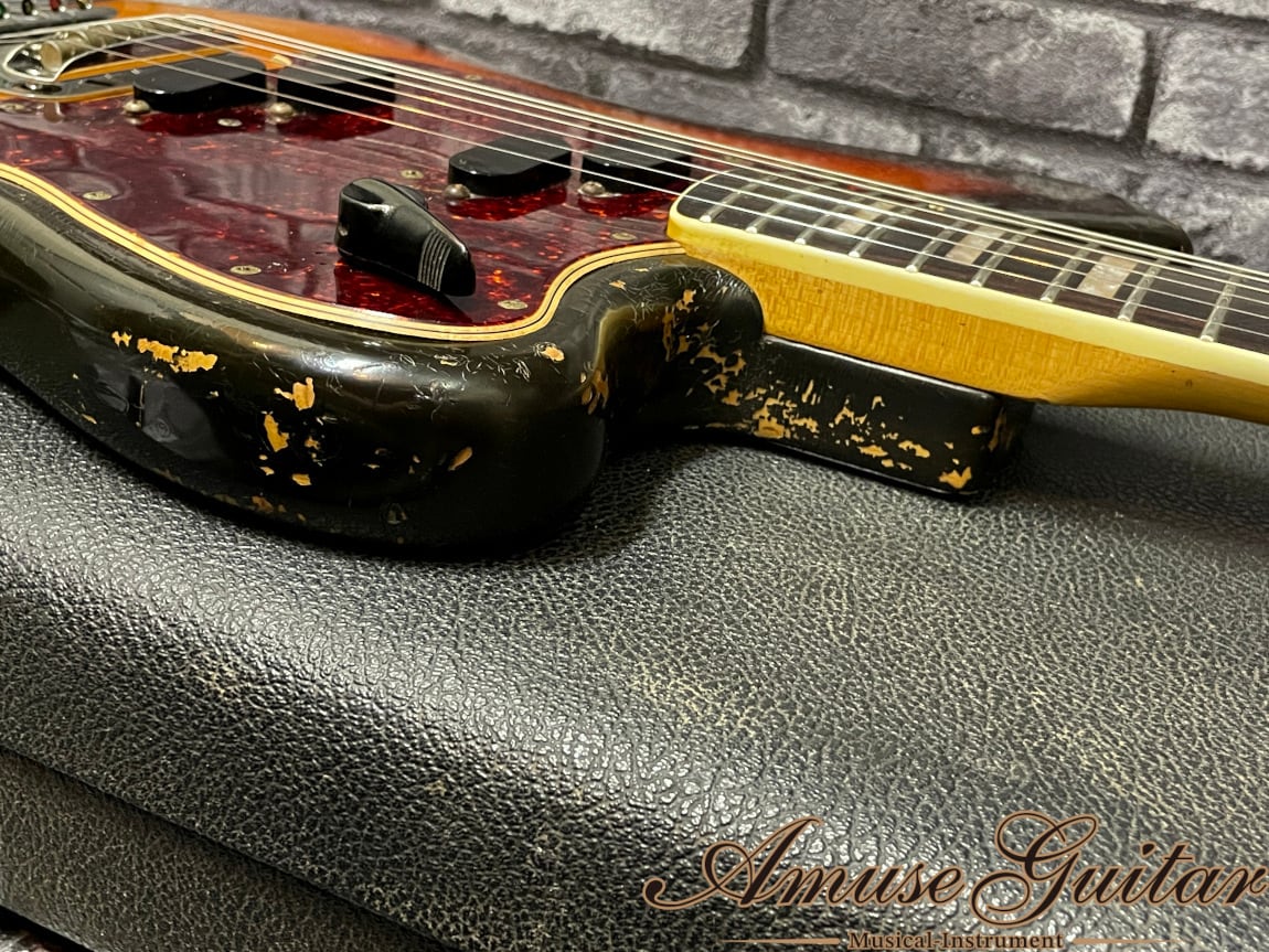 こちらのスペックはアルダーボディ、メイプルネック、希少材ハカランダ(ブラジリアンローズウッド)指板の木材マテリアル。21フレット、Bネック(実測約41mm)、ロングスケールのボルトオン構造です。Fender Electric XIIのボディ/ネックを基本としたアレンジとなっており、通称”ホッケースティックヘッド”と、抱え込みやすいオフセットボディシェイプ。ピックアップにはフロント/リア共にスプリットコイルピックアップ、コントロールは4wayロータリー式ピックアップセレクター(フロント⇔パラレルミックス⇔リア⇔アウトオブフェイズミックス)、マスターヴォリューム、マスタートーンと、多彩なサウンドを出力可能となります。ブリッジにはムスタングにも使用されていたトレモロユニットを搭載で、柔らかなビブラート効果を演奏に取り入れることができます。その他としましてはこのCustom用に製作されたオリジナルストリングガイド、ブロックインレイ、べっ甲柄ピックガード、Fキーペグ(換装品)などが挙げられます。