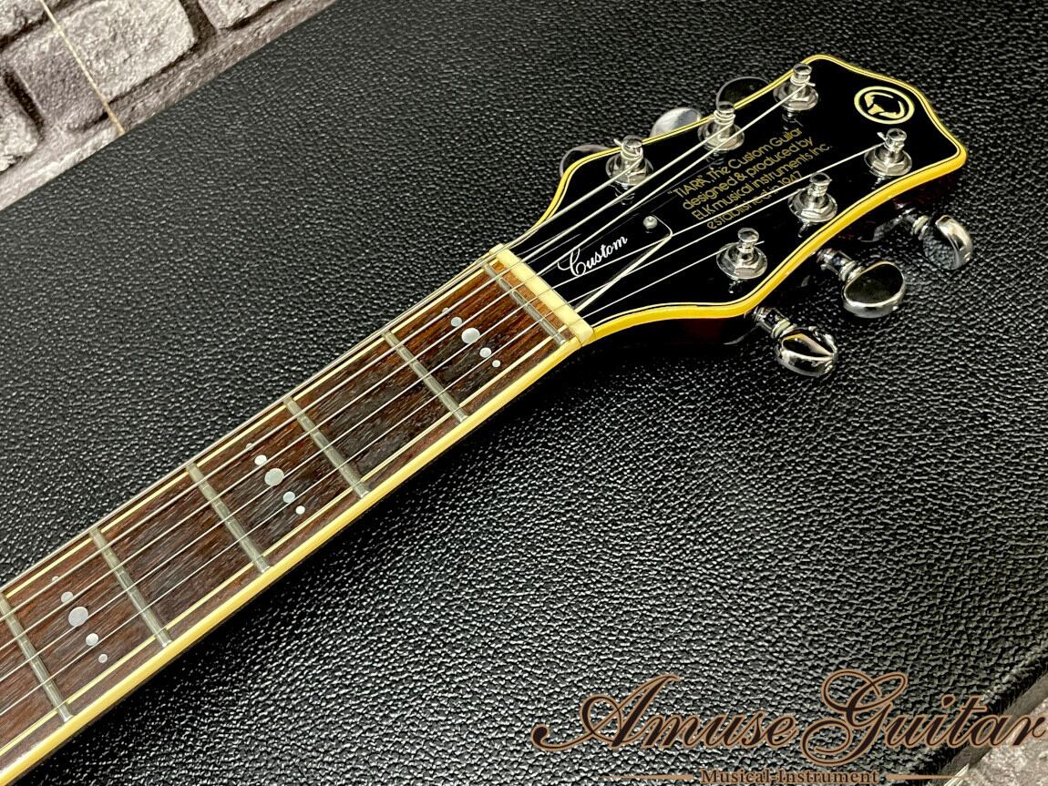 ELK(エルク)の歴史は1963年に設立、その後1968年には社名変更し株式会社エルクとなります。1960年代の国内には飽和するほどギター製作会社があり、各ブランドがあらゆるモデルを発表し、コピー品なども入り混じる中、オリジナリティを競う側面の多様際が混沌とした時代でもありました。各ブランドがしのぎを削る中、商品ラインナップのクオリティやデザイン性が高い事から矢沢永吉氏、中細野晴臣氏等のレジェンド達が愛用する事で、コピーブランドがひしめくジャパンブランドの中でも頭一つ抜ける存在感とクオリティの仕上がりが提供できることをアピールしていました。