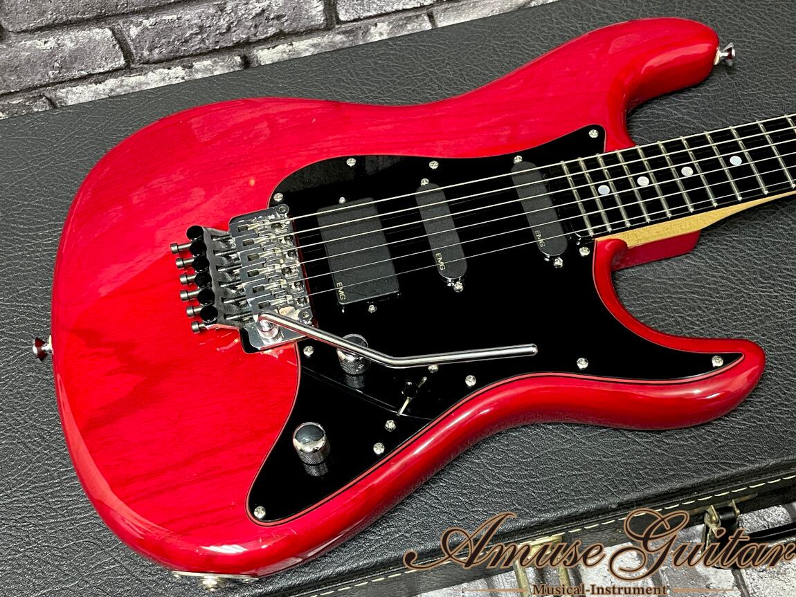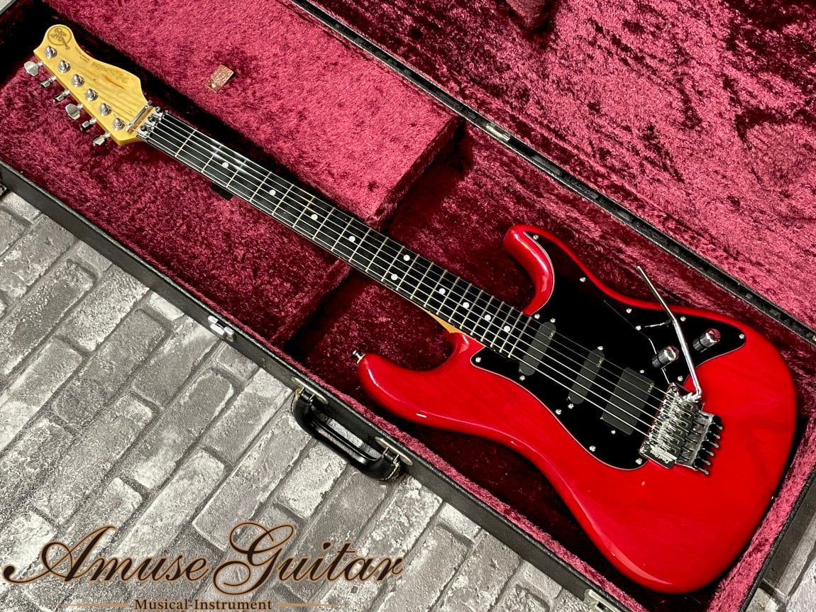 今回ご紹介させて頂くのは、90年代に日本国内にてライセンス生産されUSA製のものより比較的安価でありながら、オリジナルパーツなどを採用しつつ、高いクオリティで人気を博した初期VAシリアル、Mシリーズの一本です。当時のルカサー同様のPU配列に加え、フロイドローズ仕様の間違いのない逸品です。