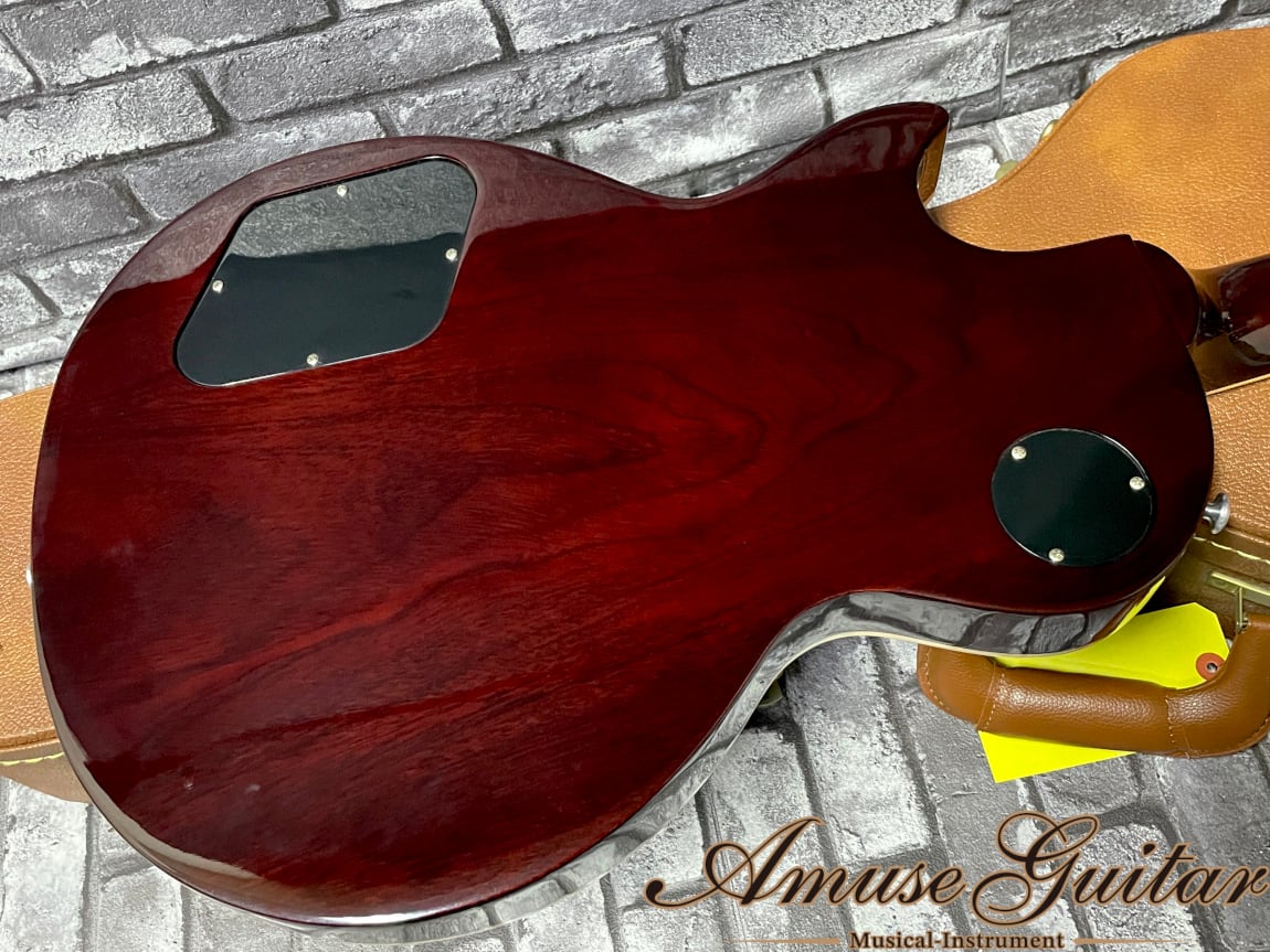コチラのスペックですが、ボディには高級感あふれる厳選されたAAAグレードの2Pフレイムメイプルトップに、バックはマホガニーのボディ。ネックにはマホガニーと、指板にはブラウンのコントラストが特段に濃いローズウッドを採用した木材マテリアルで、セットネック構造のレスポール然とした基本構成。ジョイントはレギュラー品に珍しいディープジョイント方式を採用しており、鳴りも抜群です。フィニッシュはレアカラーのルートビアバーストを採用。ネックの握りは適度に薄さを持たせた” ‘60s Slim taper”を採用し、指板にはコンパウンドラジアスも採用したプレイアビリティの高い素晴らしいプロファイルとなっております。その他としてはナットにグラフテック、ロボットチューナーペグより換装されたグローヴァーペグ、TonePros製ロック機能付きT.O.Mとテイルピースブリッジ、ゴールドスピードノブ、出荷時にてピックガードの取付が無いタイプ、12フレット上には120周年記念インレイ等が挙げられます。