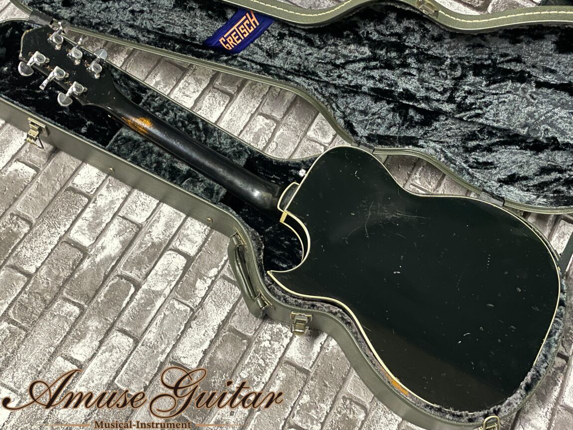 状態としましては、製造から67年の経過に準じた擦れ傷やうち傷、色やけや塗装面のダメージ、ヘッドトップのオーバーラッカー、ペグの交換、リナット等の歴戦のヴィンテージ然としたコンディションです。しかし演奏面に問題のある点は無く、即戦力でガンガン使用できます、ネックコンディションも問題なく、トラスロッドの余裕も確認済み。フレットは4~5割程となりますが、大きなビビり等も確認できません。付属品はグレッチ現行のハードケースとなり、ボディにしっかりとフィットしております。
