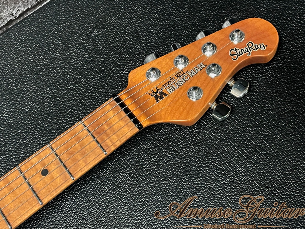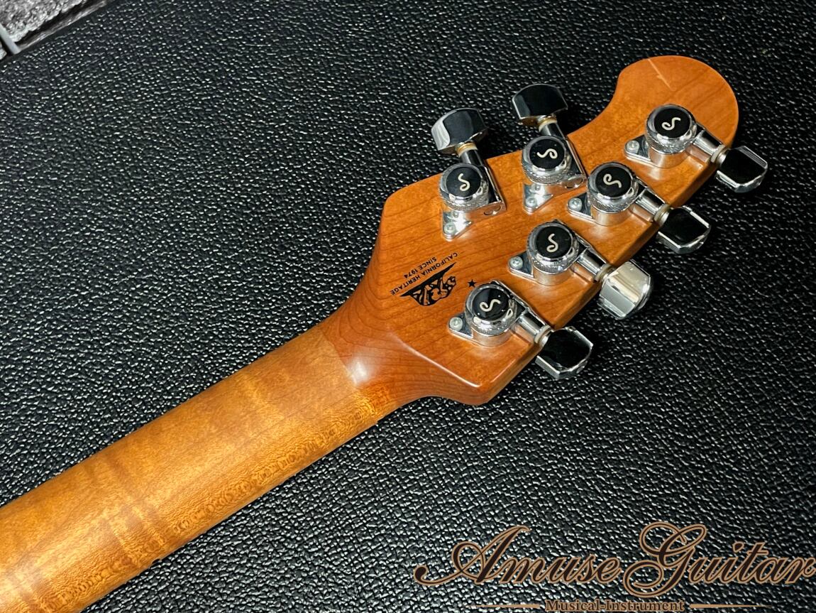 こちらのスペックですが、最大の特徴でもあるローステッドフィギュアドフレイムメイプルをネック材に採用。気候の変化が激しい日本の環境でも、その剛性を発揮する優れものです。サウンドへの影響も大きく、ドライでヴィンテージライクなレスポンスが非常に人気です。合わせてボディには厳選した軽量なアフリカンマホガニー(アフリカンマホガニー材は稀少性が高く、現行生産品はオクメ材に変更されています。)を採用した木材マテリアル。ロングスケール、22フレット(ステンレス)、5点止めボルトオン構造。絶妙なバランスのオフセットボディは抱え心地抜群。トレモロにはミュージックマンオリジナルで摩擦の少ない2点支持のシンクロタイプをマウント。その他としましては4:2オリジナルヘッドストック、音程感の優れたコンペンセイテッド・ナット、ロッド調整の容易なホイールトラスロッド等が挙げられます。