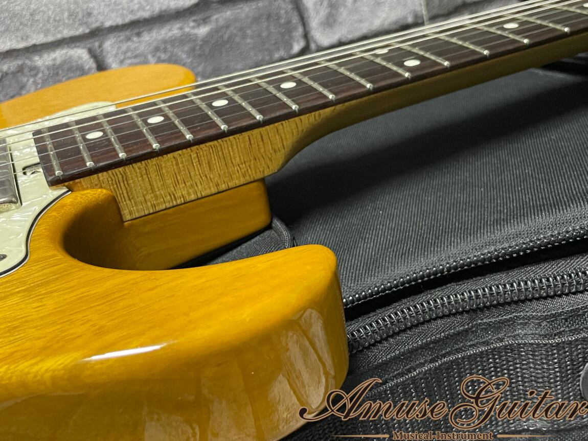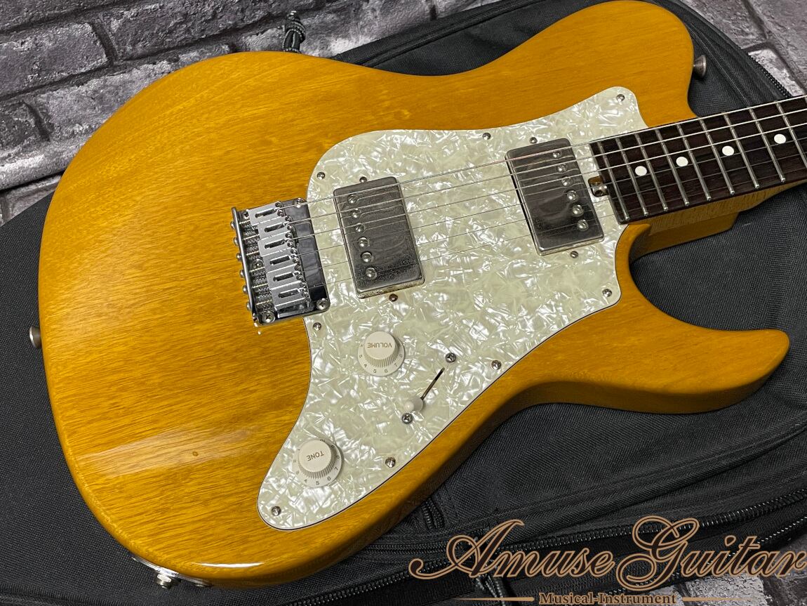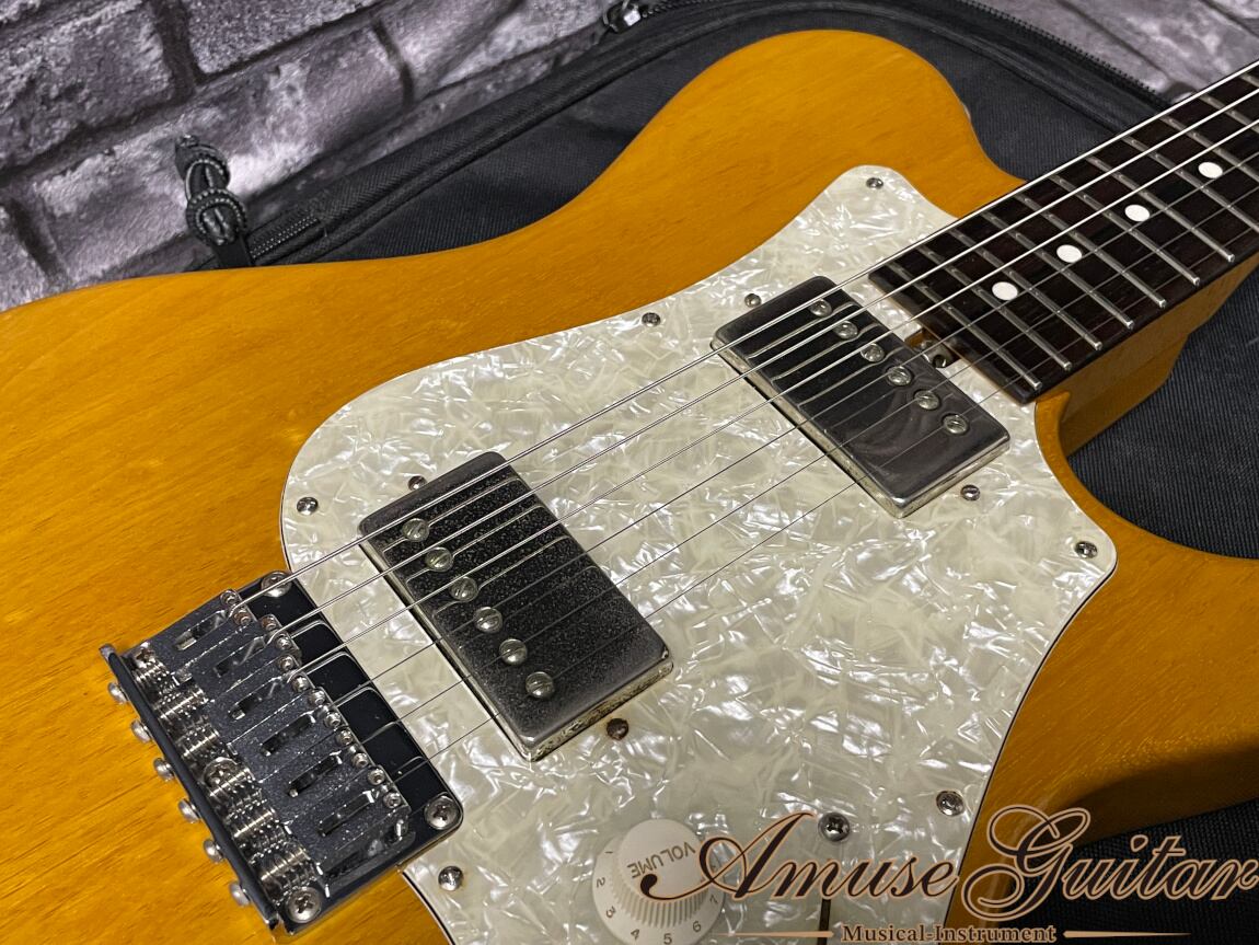 こちらのスペックですが、贅沢にも高級材コリーナを1Pにて採用したボディ、ネックは板目取りのメイプル。最大の特徴でもある指板には、希少で現在では滅多にお目にかかれない希少材ハカランダ(ブラジリアンローズウッド)が採用された木材マテリアル。ロングスケール、22フレット、41.5mmのナット幅、12Rの平らめでローアクション弦高も可能なネックは、薄めのの60’sスタイルCシェイプを採用。ナチュラルカラーがボディに採用され、コリーナボディを生かした絶妙な調色によりヴィンテージ感溢れるルックスに仕上がっています。パーツにはGotoh SD-91 H.A.P.Mペグ、Gotoh GTC-102フィクスド(ハードテイル)ブリッジ。コントロールはマスターヴォリューム、マスタートーン(Push⇔Push w/コイルタップ)、3wayピックアップセレクターです。