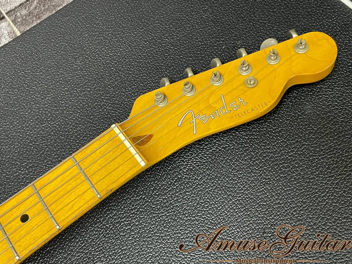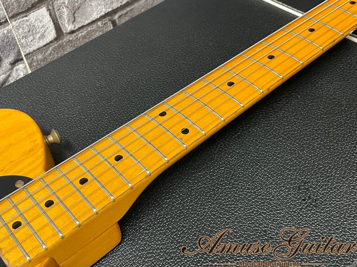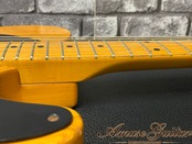 こちらのスペックは木目の整ったアッシュのボディ、ネックには上質な1Pのメイプル(板目)を採用した木材マテリアルです。その他としては、3wayピックアップセレクター、マスターヴォリューム、マスタートーンのコントロール。5点留めとなる1Pブラックガード、6コマサドルのブリッジ(換装品)、クルーソンタイプチューナー、円盤型ストリングガイド、モデルロゴが+ブランドロゴだけ入った52年仕様、ヴィンテージサイズフレットの21F仕様、指板ラディアスは7.25”、ビス類はトラスロッドアジャストを含め、交換個所もございますが殆どマイナスビスにて統一されております。ストラップピンはダンロップロック対応のものに交換されています。