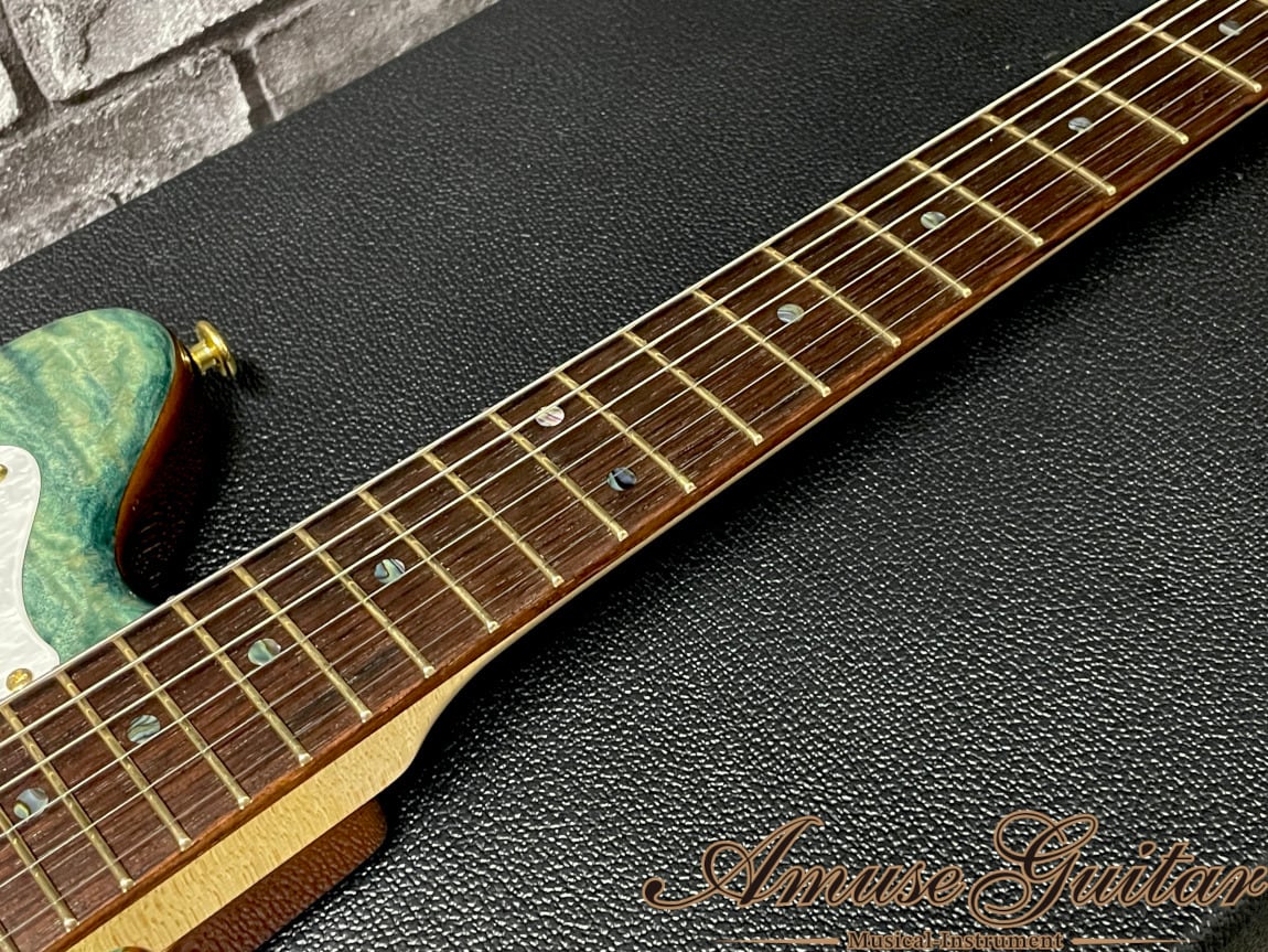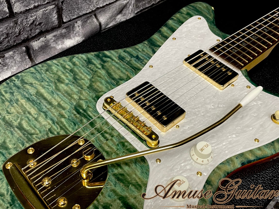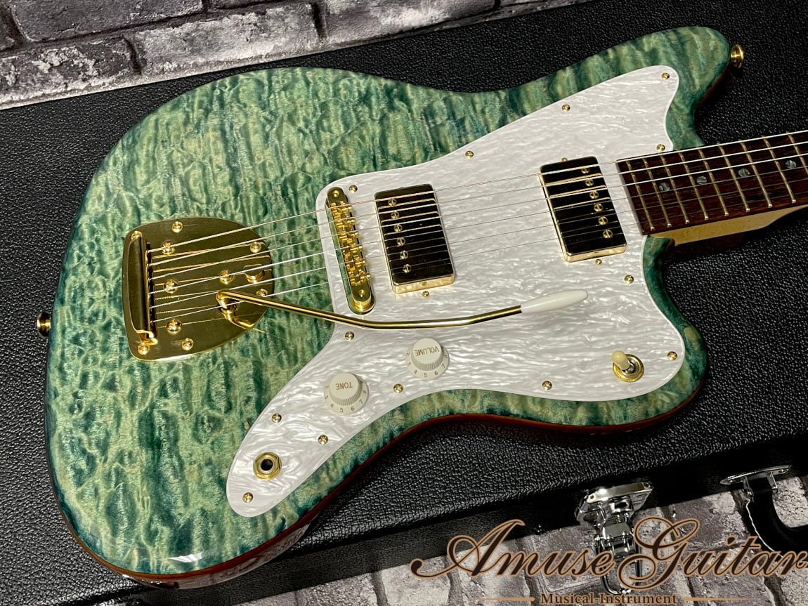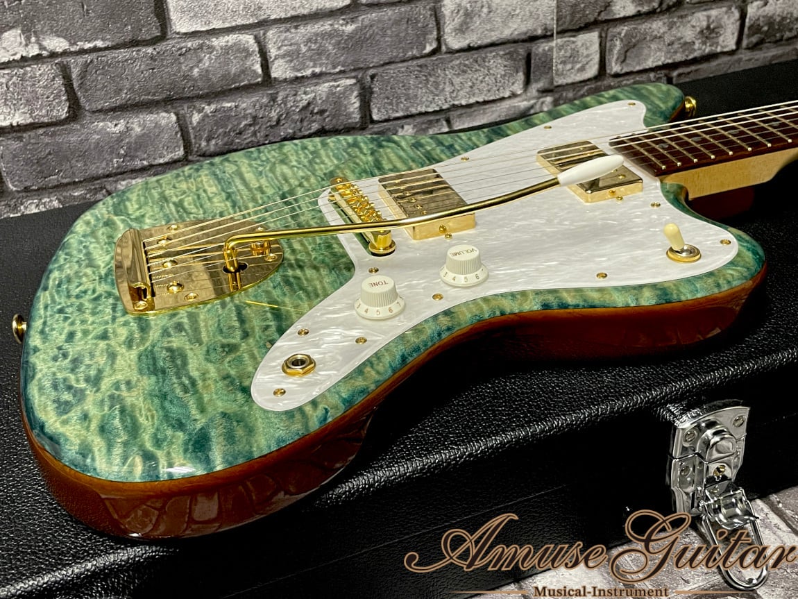 こちらのスペックですが、まず目に飛び込んでくるのはボディトップ/ヘッドトップの美しいグリーン寄りの美しいブルー。この彩度/杢目の美しさを引き立たせる為にグレードの高い、深く大きなフィギュアド杢目が出たキルテッドメイプルを採用。ボディバックにはJMサイズでは珍しいアッシュ1P。ネックには板目取りに加え、僅かにバーズアイ杢目も確認できる良質なメイプル。指板はまるでハカランダの様な濃いブラウンコントラストと木目が特徴のマダガスカルローズウッドを採用した木材マテリアル。握りやすいCシェイプのネックにはサラサラとした木の質感を生かした塗装が施されており弾き心地は抜群です。その他としてはオイルボーン(41.5mmナット幅)に310R/25.5インチ(ロングスケール)つばだし22フレットのネック。GOTOHのゴールドパーツにて統一。ペグには弦の巻き数も最小限に抑えられ、チューニング精度の安定化、弦交換も用意となるダイヤルロック式SG381-07 MG-T。ブリッジはABR-1TypeにJMタイプには欠かせないフローティングトレモロ。JescarのEvolution Goldフレット、シンプルなコントロール(3wayトグルピックアップセレクター/マスターヴォリューム/マスタートーン)等が挙げられます。