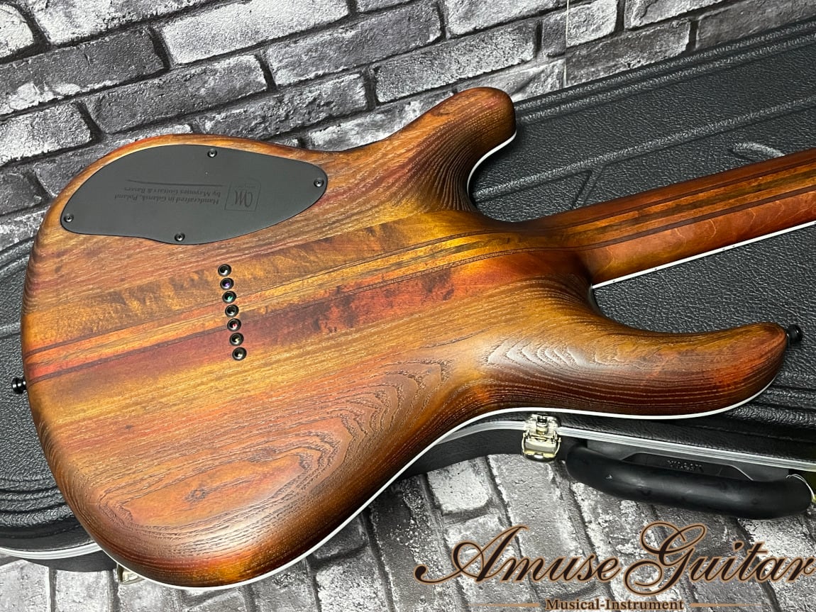 こちらのスペックは、アッシュトップ/スワンプアッシュバックのボディに、【メイプル/マホガニー/ウェンジ/アマザコエ(オヴァンコール)】を使用した11Pの剛性と木材鳴りの優れたネック、そして最近ではめったにお目にかかれない漆黒の良質なエボニー指板のスルーネック構造。24フレット、25.4インチ(645mm)、指板16R、ワーグナーのジャンボフレット、グラフテックのナット幅は48mm。ブリッジにはABMのフィクスド(ハードテイル)タイプを採用、ペグにはHipshot製のダイヤルロック式を搭載し、弦交換の煩わしさの短縮や、チューニング精度の向上に一役買っています。コントロールは非常にシンプルで、3wayピックアップセレクターとマスターヴォリューム(w/Coil Tap)、マスタートーンとなります。その他としましては、ボディトップ/ネック/ヘッドトップにバインディングが採用されており、引き締まった印象を魅せます。