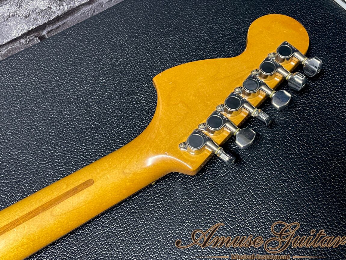 こちらのスペックはオーダー用に厳選されたと思われるアルダーボディ、板目取りのメイプルネックに、スラブ貼りのローズウッド指板の木材マテリアル。牛骨ナット(42mm)、薄めのUグリップ、21フレット、ロングスケール、ヴィンテージサイズフレット、9.5Rを採用したネックをボルトオン構造にて組み込み。大きな特徴として、F刻印のBigsbyトレモロと、ラージヘッドの採用が目に飛び込みます。カタログスペックではありえない特別なルックスと、それぞれの特徴である低音が効いたロックなサウンドが印象的です。その他の仕様としましては、GOTOHロトマチックペグ、羽根型ストリングガイド×1、ブレットトラスロッドナット、FENDER刻印入りジョイントプレート、3Pホワイトガード、ビグスビー用ブリッジプレート&スパイラルブリッジ、ボディバックにストリングブッシング、ジャックカップアウトプット等が挙げられます。