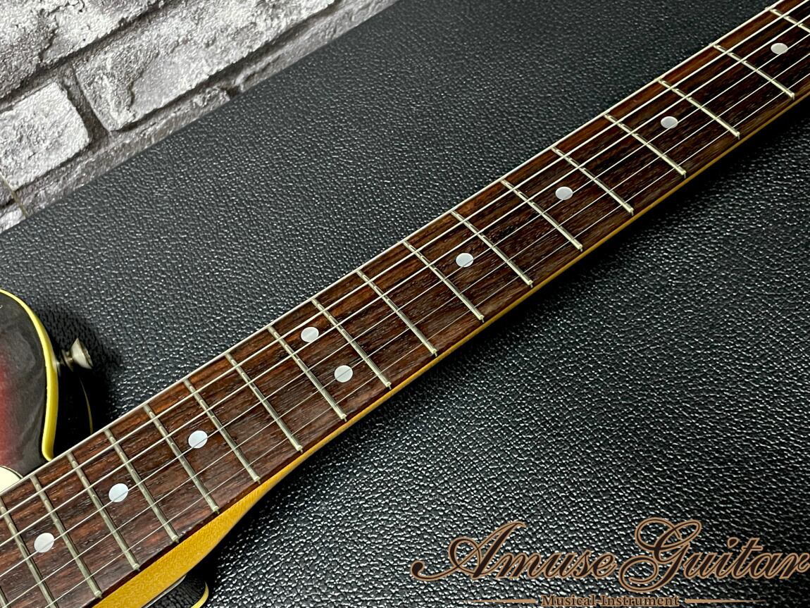 気になるサウンドですが、これぞフジゲン期の鳴り感!とワンストロークで感動できるサウンドを体感できます。前述の通り低音の効いたスペックが魅力で、テレキャスター然としたトレブリーな成分と絶妙に相まって、豊かなレンジを放つ素晴らしいサウンドをアウトプットします。ビブラートユニットとしても緩やかな音程変化が魅力ですが、ビグスビーユニット特有となるサスティーンの余韻も心地よく、他には無いキャラクターが光ります。激しくストロークしたロックなドライブサウンドも、自然なリヴァーブ感を生かしたクリーン~クランチサウンドも絶品で、プレイヤーの個性がひと際フォーカスされる仕上がりです。