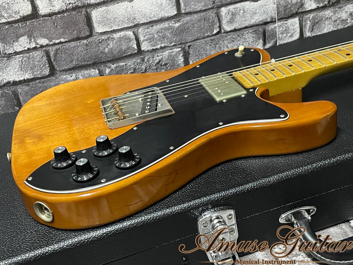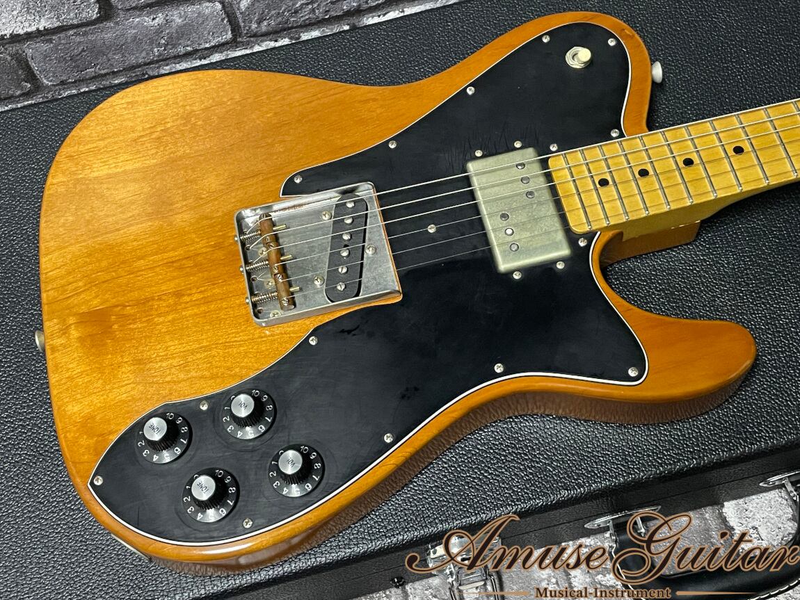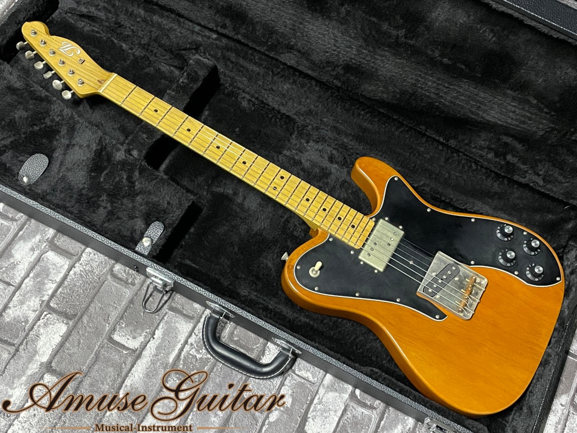 今回ご紹介させていただきますのは、そのTBギターワークスのテレキャスターカスタムタイプの一本。70年代フェンダーを象徴するウォルナットカラーを彷彿とさせるフィニッシュが目を引く本機に、エイジング加工を施し、まるで丁寧に扱われてきたリアルヴィンテージギターのオーラをも纏う至高の逸品。そしてなんとこちらは、前述のOfficial髭男dismの大輔氏所有機と同スペックを採用した個体で、ヴィンテージフリークはもちろん、ファンの方も見逃せない珍しいアイテムです。