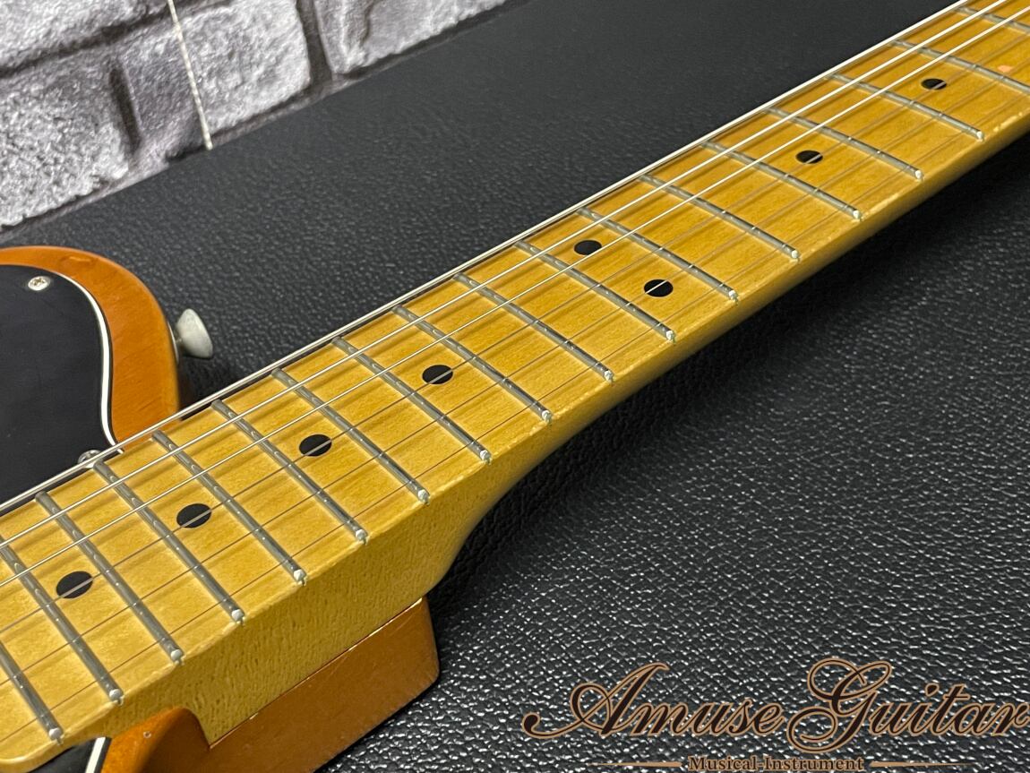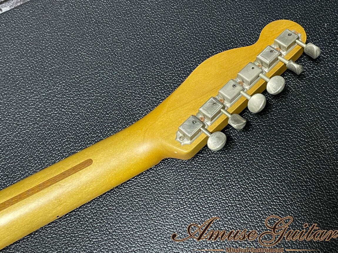 こちらのスペックですが、厳選された軽量な”ライトウェイトアルダー”材をボディに、ネックには板目取りのメイプルを1Pにて採用した木材マテリアル。ヴィンテージ牛骨ナット(42.86mm)、59スタイルグリップ、22フレット、ロングスケール、6150サイズの細く高めのジェスカーフレット、10-12Rのコンパウンドラジアスを採用したネックをボルトオン構造にて組み込み。ボディ/ネックそしてパーツにも経年劣化を再現したエイジングは非常にリアルで、わざとらしさは一切なく、モカフィニッシュの退色した様な仕上げを含めまるで本物のヴィンテージギターの風格を纏っています。その他としましてはオリジナルヘッドストック、GOTOHクルーソンタイプペグ、羽根型ストリングガイド、3Pブラックガード、ブラスサドルブリッジ、ピックガード上のセレクター/2ヴォリューム/2トーンのテレキャスターカスタム然としたコントロール、ジャックカップアウトプット等が挙げられます。