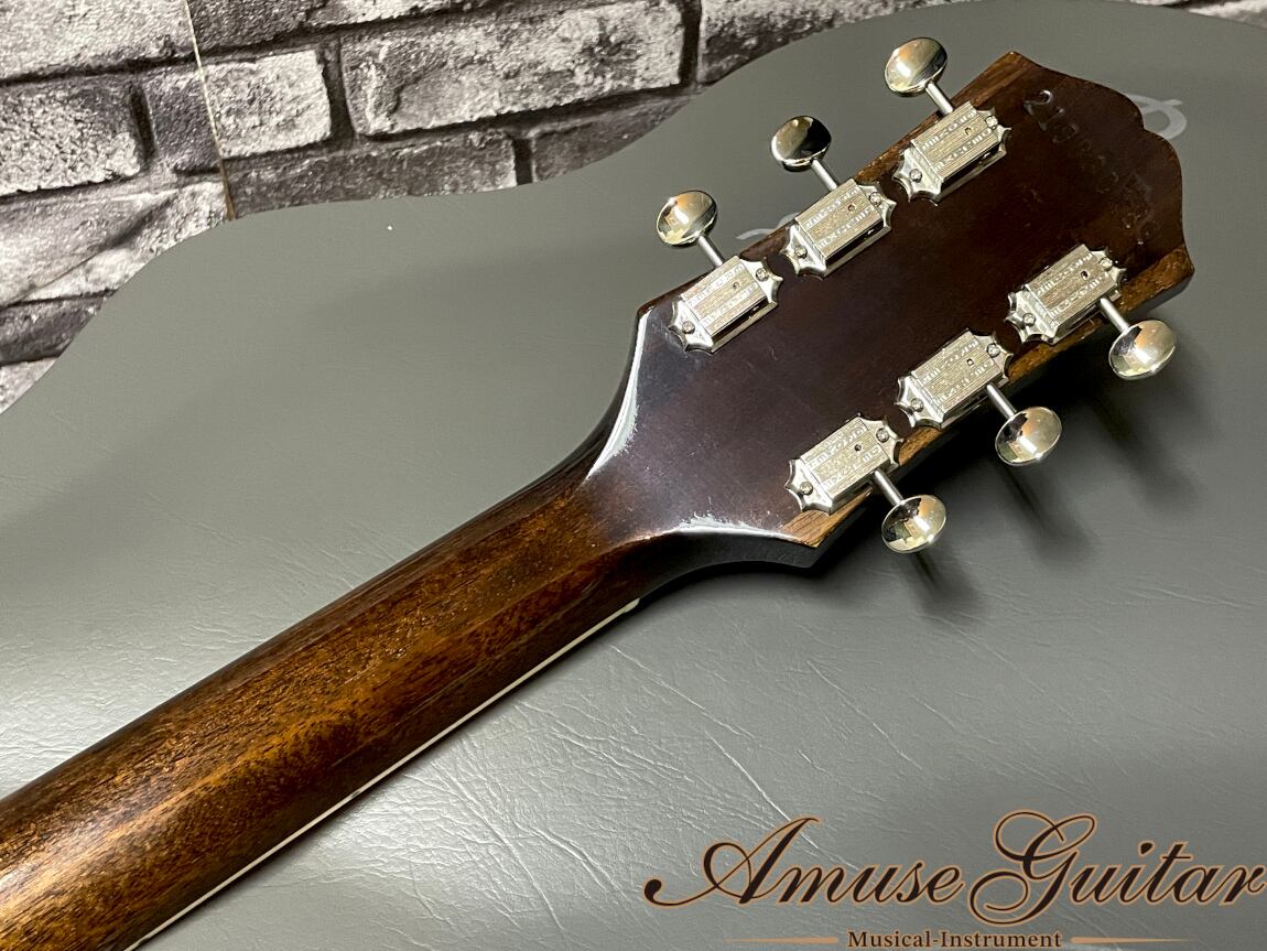こちらのスペックは、メイプル-ポプラ-メイプルの3Pのフルホロウ(フルアコ)ボディに、1Pマホガニーネック、ブラウンのコントラストも効いた高級感漂うローズウッド指板を採用した木材マテリアル。そしてなんといってもボディ&ネックのニトロセルロースラッカーグロスフィニッシュ仕上げ。ペグにはグローヴァー製ヴィンテージボタンタイプ。ブリッジにはT.O.M(ノンワイヤー)にトラピーズテイルピースを採用。その他としましてはファットヘッド、ヴィンテージを意識したブラック/ブラウンの部分が濃いカラーリングのサンバーストなどが挙げられます。