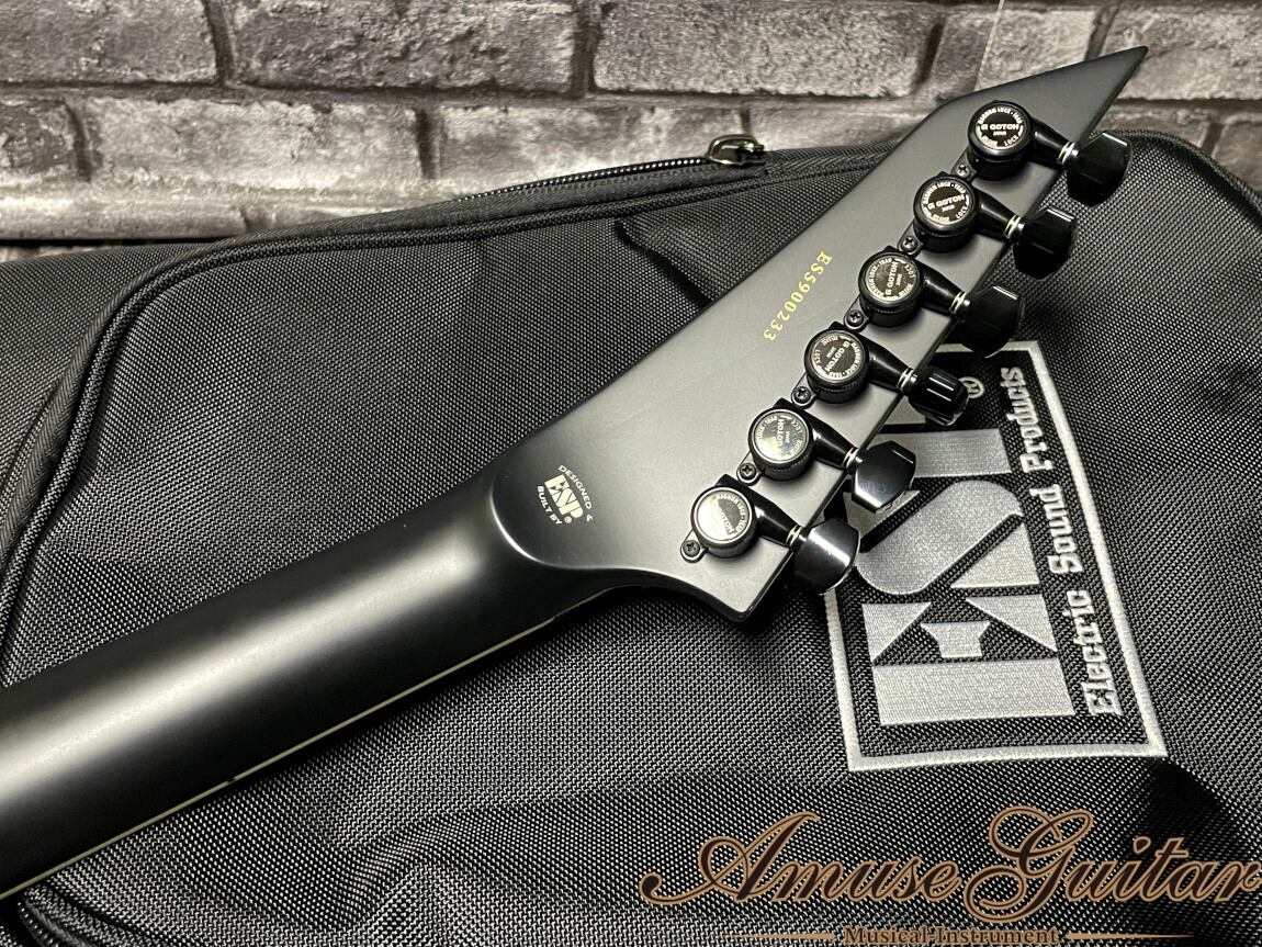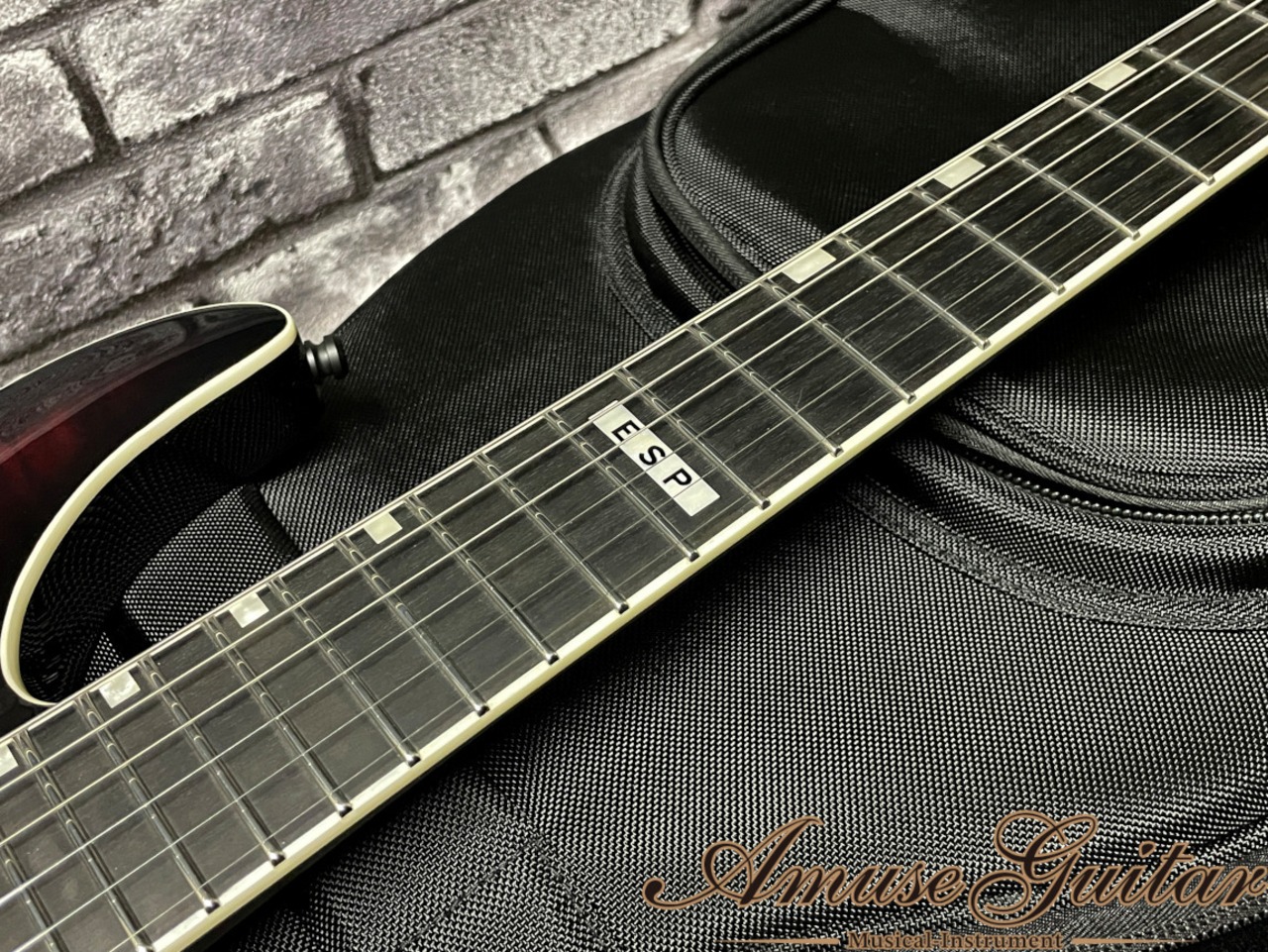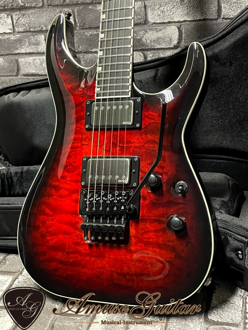 今回ご紹介させていただきますのは、そのESPがプロデュースするE-Ⅱシリーズの一本。コストパフォーマンスモデルラインとしながらも国内製造に加え、ESPと使用パーツ/組み込みは全く一緒というハイクオリティなラインナップとなり、James Hetfieldや、Mille Petrozza、なんとあのMadonna等の大物アーティストもステージで使用する程の完成度です。一番人気と言っても過言ではないホライゾンのフロイドローズ仕様となっており、マルチな用途での使用ができるお勧めの一本です。
