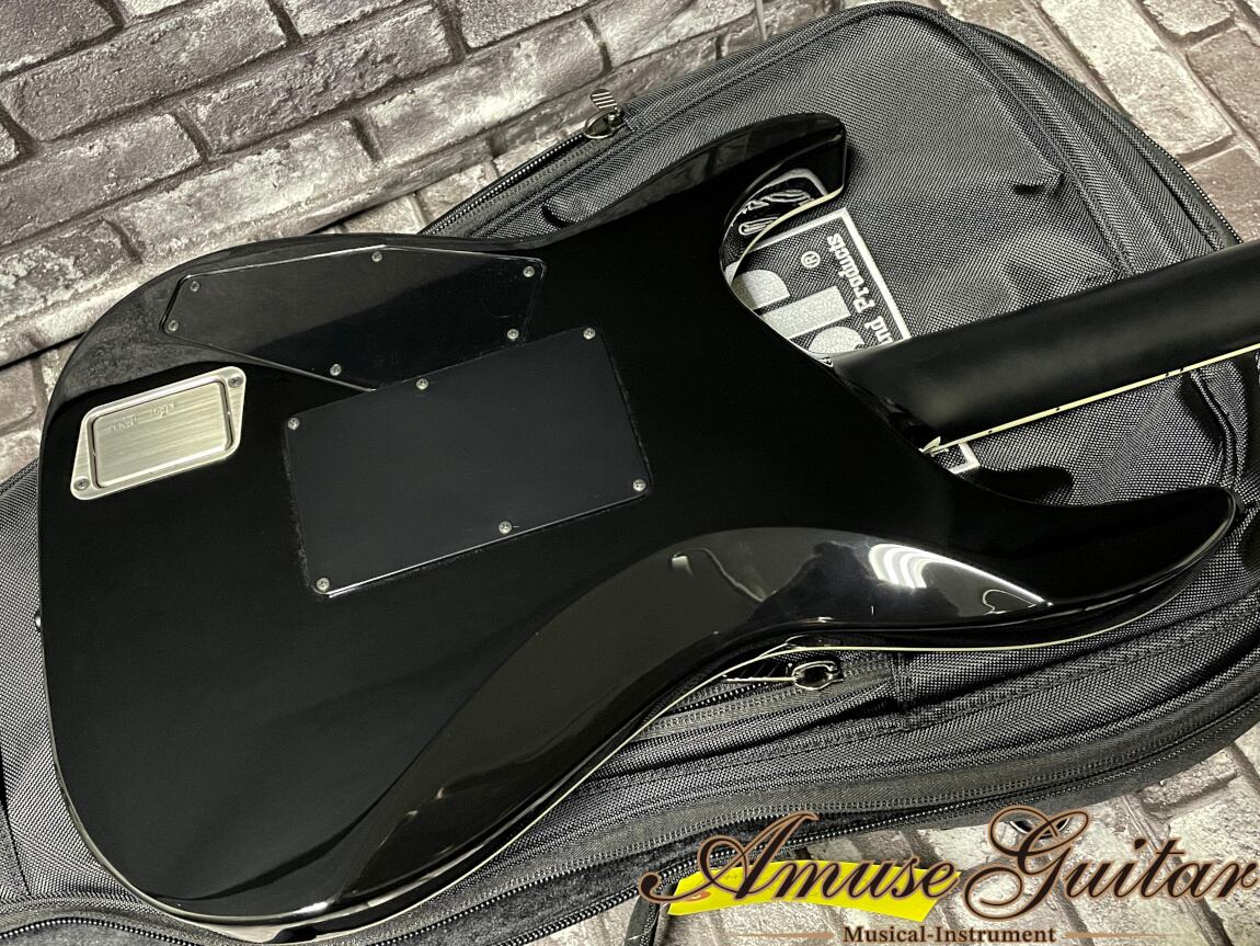こちらのスペックですが、マホガニーバック/キルテッドメイプルトップに、メイプルネック/黒々としたエボニー指板の木材マテリアルが採用されたロングスケール、24フレット、ジャンボフレット、42mmナットのスルーネック構造。ブリッジにはドイツ製フロイドローズトレモロが搭載されており、激しいアーミングから繊細なタッチまで安定したチューニングにて演奏可能です。その他としましては、GOTOH SG360-07 MG-Tのダイヤルロックペグ、シャーラーロック対応ストラップピンが挙げられます。