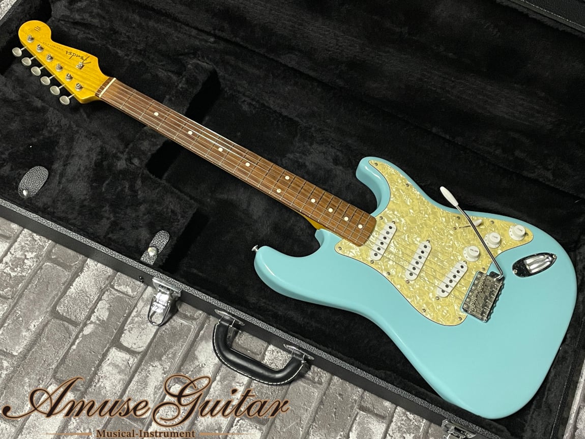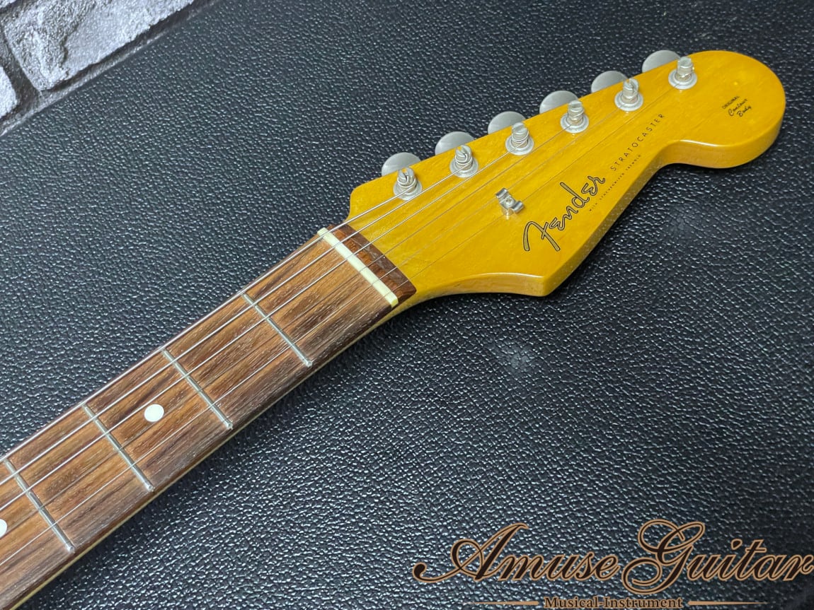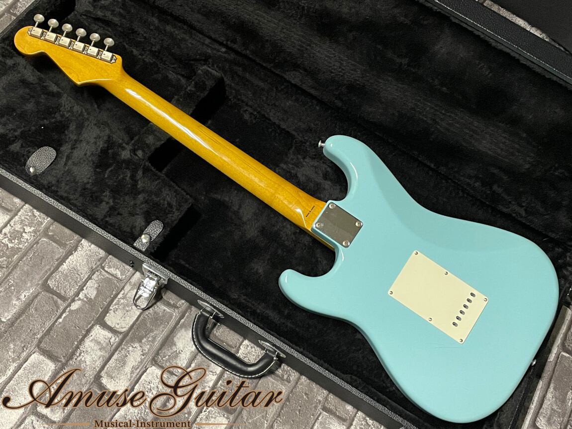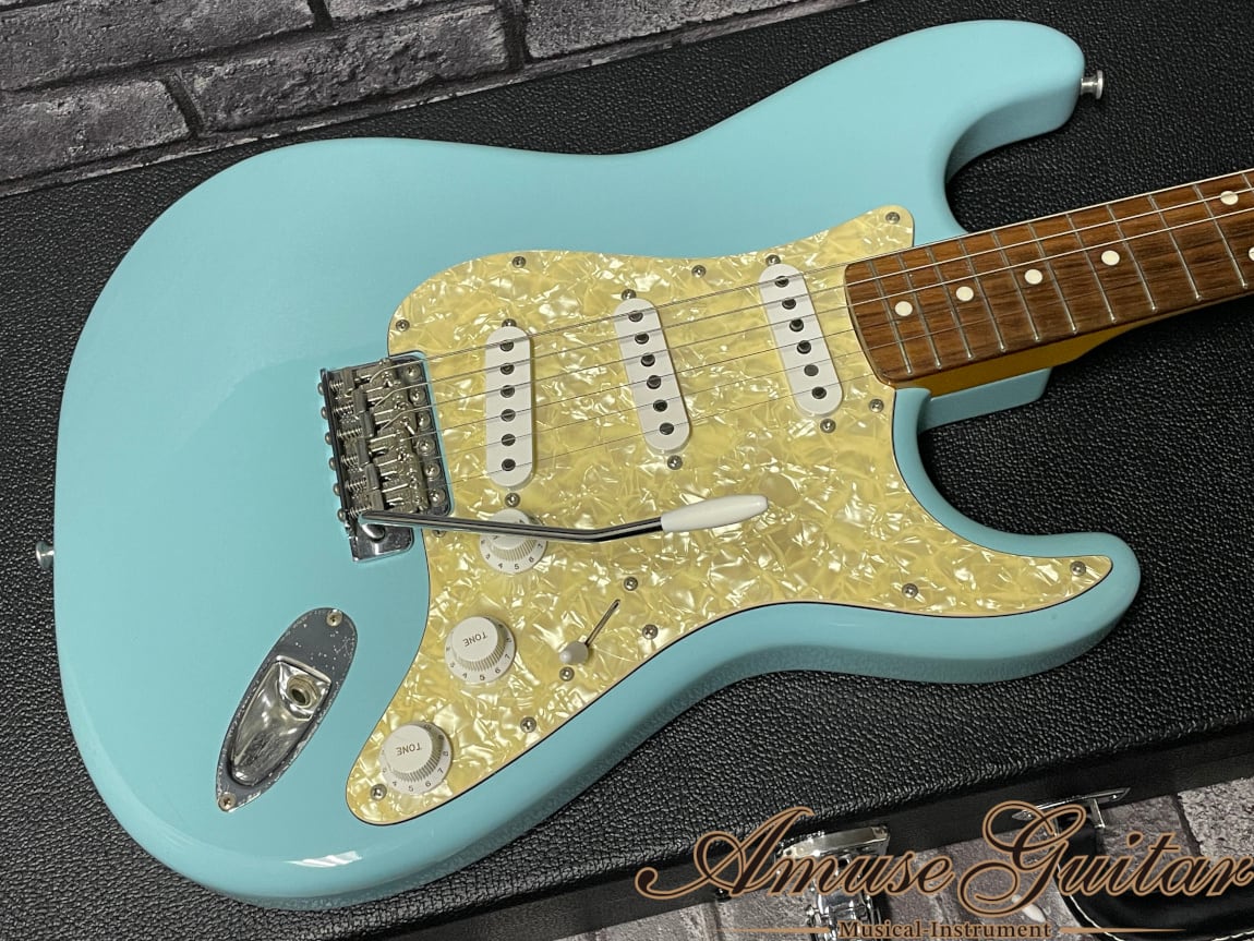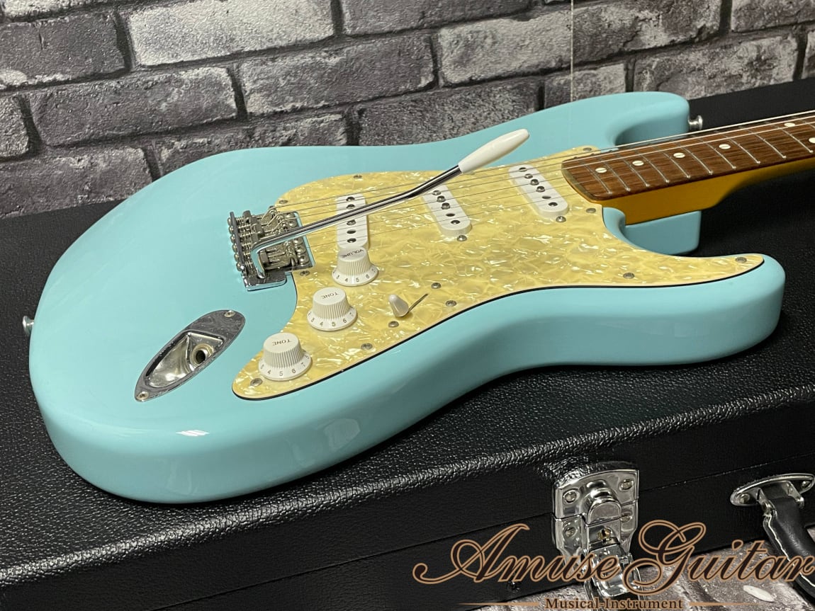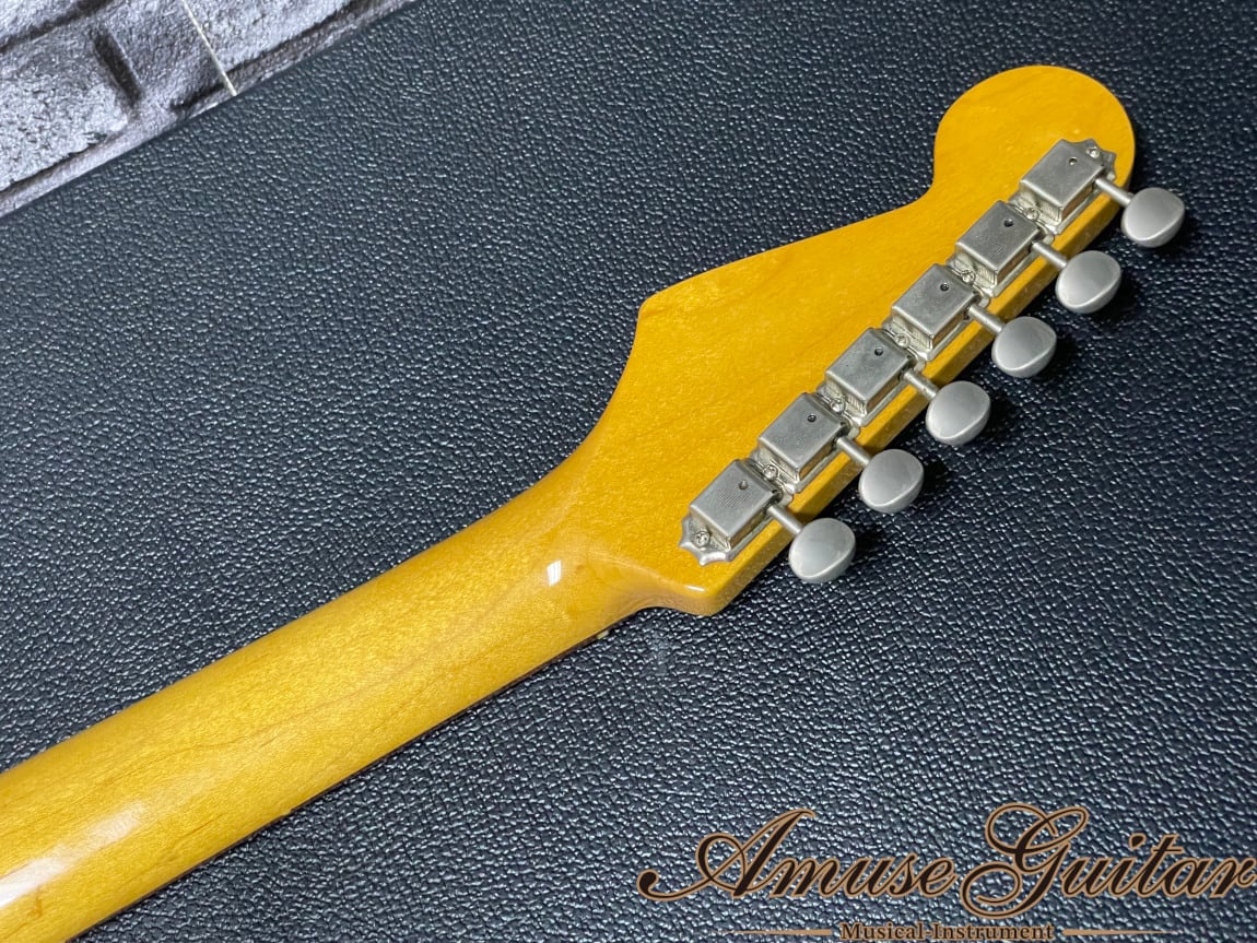 こちらのスペックは、ボディにバスウッド、ネックはフレックラインも確認できる板目取りの良質なメイプルと、ローズウッド指板のストラト然とした木材マテリアル。ロングスケール、7.25R、ヴィンテージタイプフレット、握り心地の良いUシェイプネックのボルトオン構造。スモールヘッド、波型ストリングガイド、11点止め3Pパールピックガード(換装)、クルーソンタイプ6連ペグ、6点止めシンクロナイズドトレモロにコマはFender刻印など、ヴィンテージスペックを余すことなく再現した細部にもこだわりが光ります。