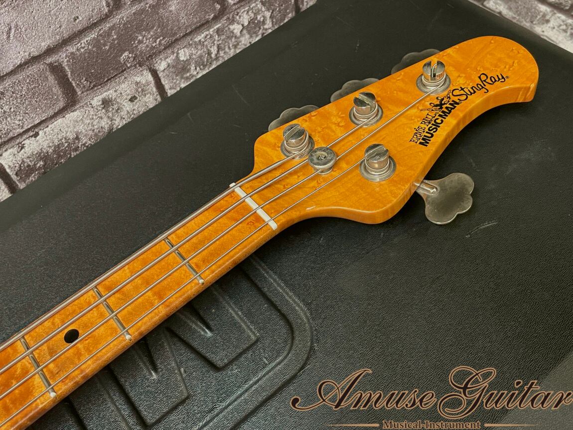 今回ご紹介させていただきますのは、そのミュージックマンのエレキベースラインナップの中でもフラッグシップモデルでもあるスティングレイです。定番の一本とはなりますが、今回入荷品はネックに極上のフィギュアドメイプルを採用したプレミアムなもので、数々の同モデルが中古市場にございますが唯一無二の激レアスペックとなっています。それに加え、製造より26年の歳月が経過したことを一切感じさせない美品状態をキープした”凄すぎる”逸品となります。