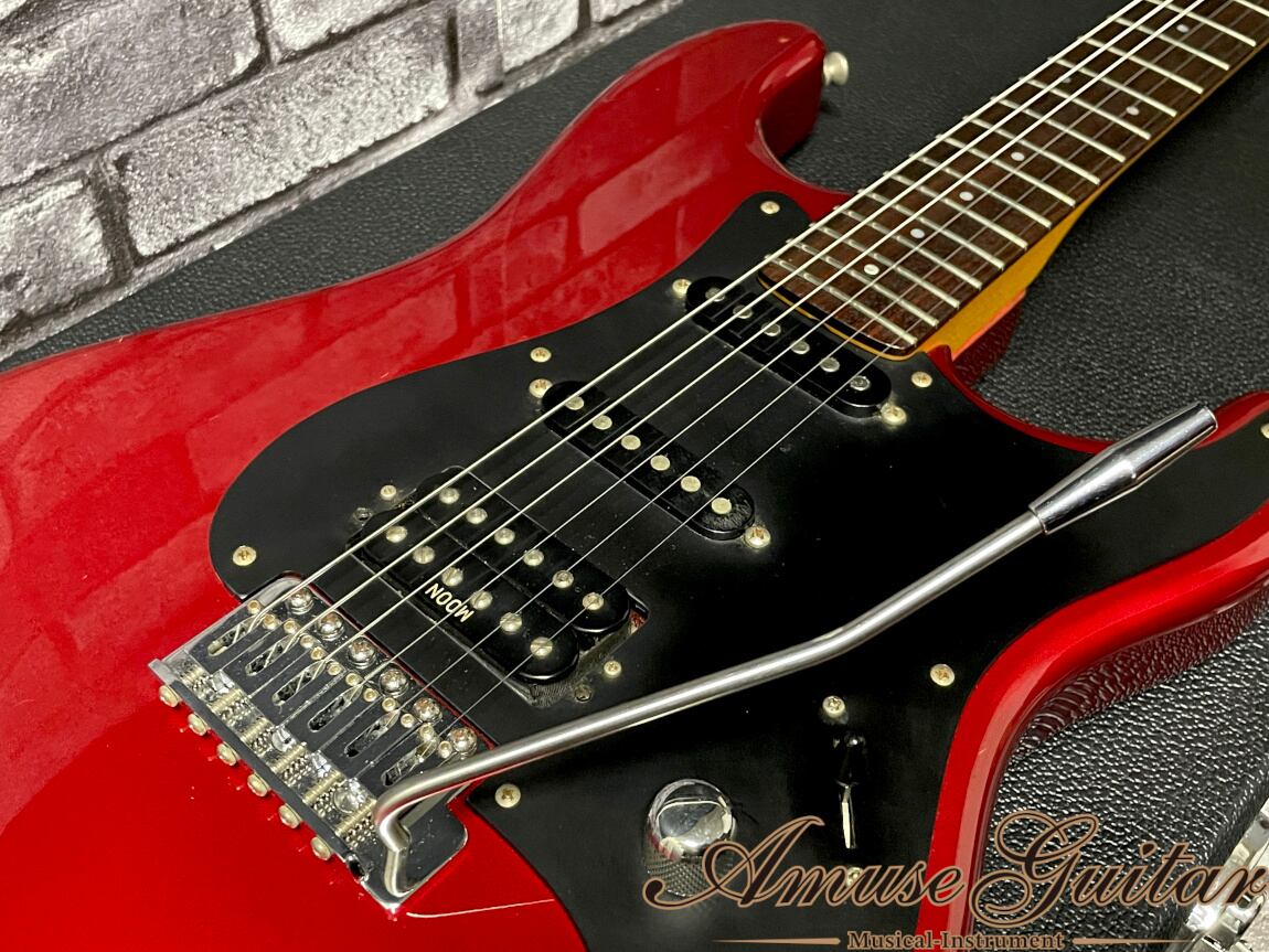こちらのスペックですが、ボディ材はアルダー。追い柾目となるメイプルネックに、濃い色味にて良質な事が伺えるローズウッド指板の木材マテリアルです。乳井氏考案の今では様々なブランドでもよく見るつば出し22フレット、ロングスケール、約10R、大きめのフレット、握り心地の良いCシェイプネックのボルトオン構造。その他としましては、MOON刻印入りクルーソンタイプペグ、丸形ストリングガイド、牛骨ナット、パールポジションドット、MOON刻印入りジョイントプレート&クッション、8点止めブラック1Pピックガード、ブラス製イナーシャブロックのシンクロトレモロブリッジなどが挙げられます。