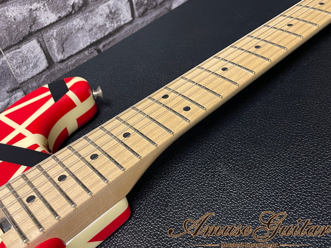 こちらのスペックですが、ボディにはサウンドレンジの広さからEVH本人にも非常に気に入っていたバスウッド、柾目取り(クオーターソーン)のメイプルネック&メイプル指板の木材マテリアル。ボルトオン仕様の22フレット、ロングスケール。VAN HALEN最大の転換期である『1984』のリリース辺りから、マイケル・ジャクソンのBeat itでの名演、80年代後半リリースのサミー・ヘイガー期の一旦終わりである『OU812』辺りまで愛用されていたクレイマーを細部まで彷彿とするルックスがファンにはアツいポイントです。トラディショナルなSTシェイプ&バナナヘッドストック、トレモロ&ナットはロック式のフロイドローズをノンリセスにて採用で激しいアーミングも耐えうるチューニングの安定性を誇ります。その他としましては、Cシェイプのサテン仕上げネック、フレットはミディアムジャンボタイプ、指板Rは12”-16”のコンパウンドラディアス、マスターヴォリュームのみのコントロール、6弦を瞬時にドロップチューニング可能とするD-Tuner搭載となります。