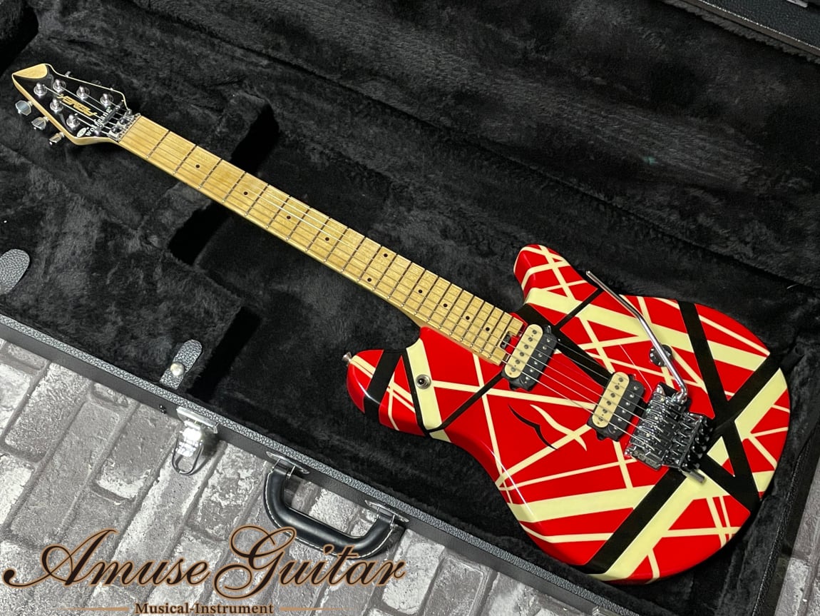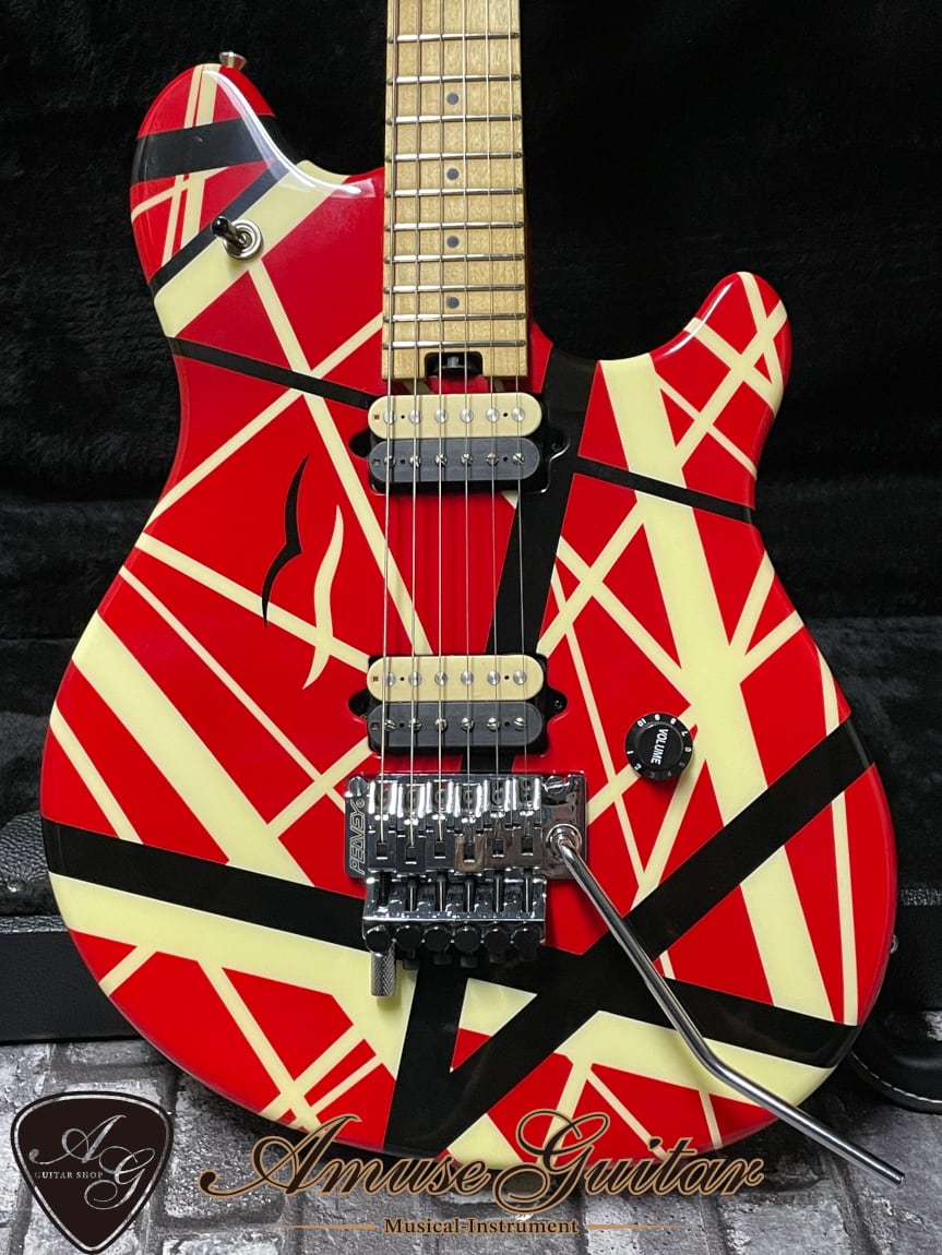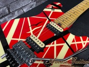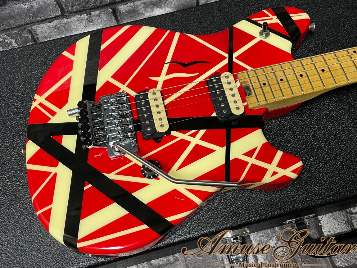 今回ご紹介させて頂きますのは、そのピーヴィーの代表的モデル” EVH Wolfgang”にEVHといえば!のストライプ柄を採用したフィニッシュの一本。元々ピーヴィーのリリースカラーには存在しないフィニッシュですが、2004年のライブにて息子ウルフギャングとステージで初共演した際にも使用されたEVHフリークには印象深いモデルとなります。本機は国内大手楽器店様の独自企画にて販売されたもので、ファンにはたまらない非常に珍しい逸品となります。