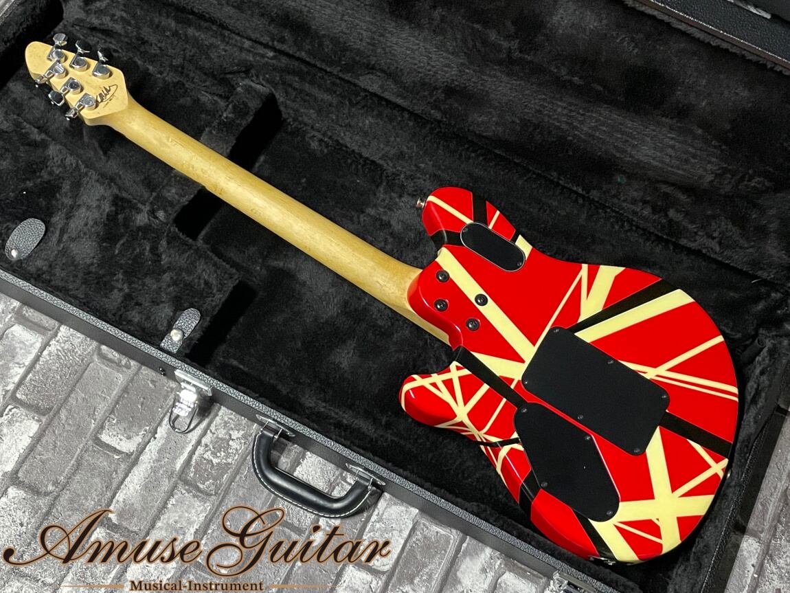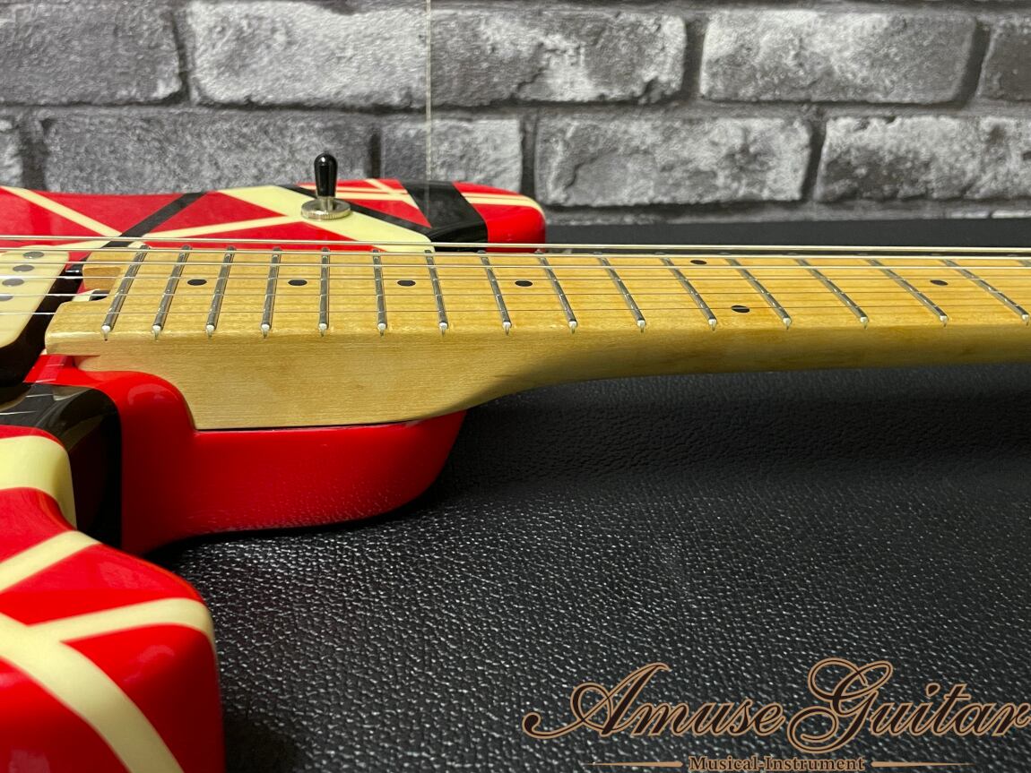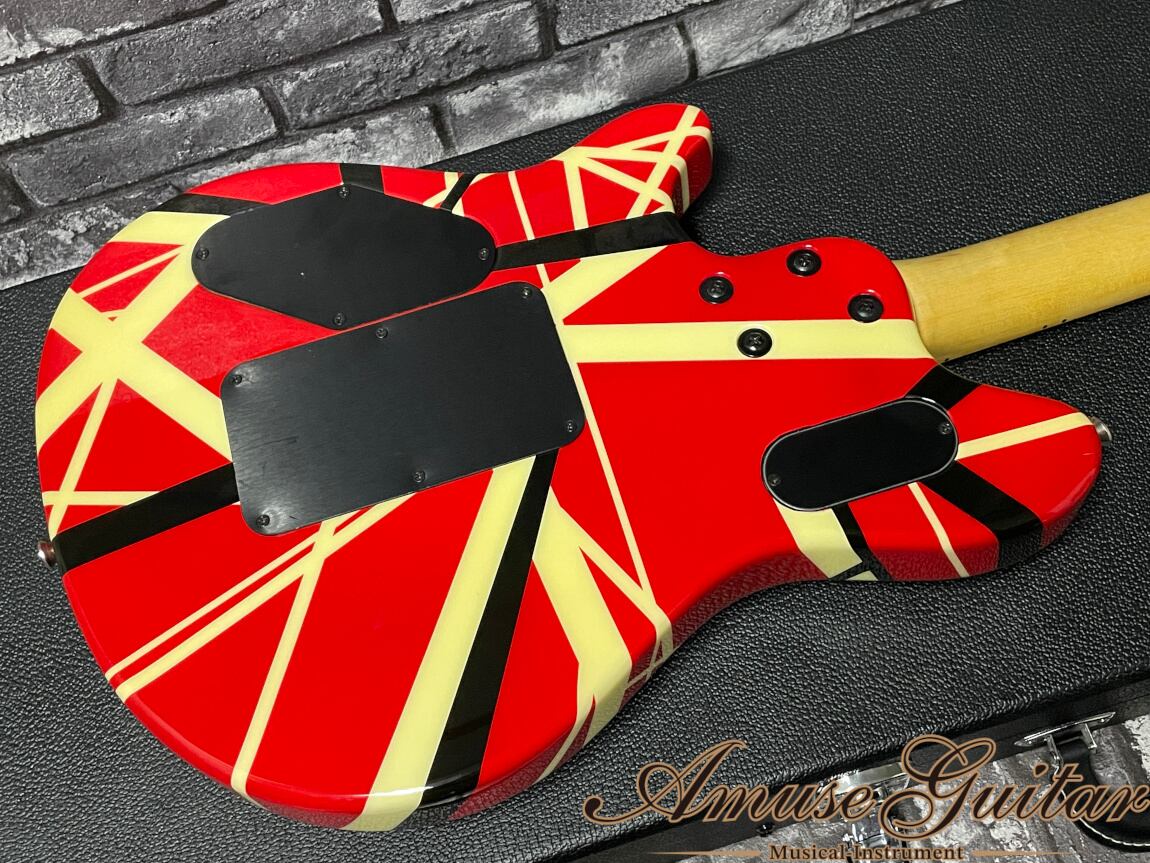 こちらのスペックですが、ボディにはサウンドレンジの広さからEVH本人にも非常に気に入っていたバスウッドをボディに、カーボングラファイトによって補強されたネックには強固なメイプルを採用。もちろん指板は貼りメイプル仕様です。そしてボディに塗装されたストライプ柄は、大手楽器店様の塗装部門にて施されたカスタム仕様のグロス仕上げ。さすがのクオリティでまるで製品として最初からサインナップされていたかの如く、存在感のあるオーラを放ちます。ネックシェイプは手の形状にあったフィット感良い非対称シェイプ。その他同じ向きに合わされたゼブラカラーのハムバッカーやPeaveyロゴ入りフロイドローズ&ロックナット、D-Tuner、シャーラーチューナーなどが挙げられます。またヘッド裏には本国USAメイドを示す91シリアル、ゴールドロゴ、PAT.PEND焼印、EVHロゴ等が確認できます。