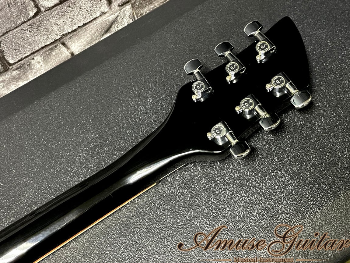 こちらのスペックですが、メイプルボディに、メイプルネック/ローズウッド指板のスルーネック構造となっております。ボディエンドまで伸びるネック材は、小ぶりなボディとは思えないサスティーンと、コシのあるサウンドの秘訣になっています。24と3/4インチ(ミディアム)スケール、10R指板に、4点支持のブリッジ、”R”テイルピースなど、リッケン社独自の特徴的なポイントも抑えており、その全てがサウンドへ影響する複合的足し算から生まれる鳴りはプレイヤーを魅了します。その他としましては、ペグにシャーラーM6を採用。