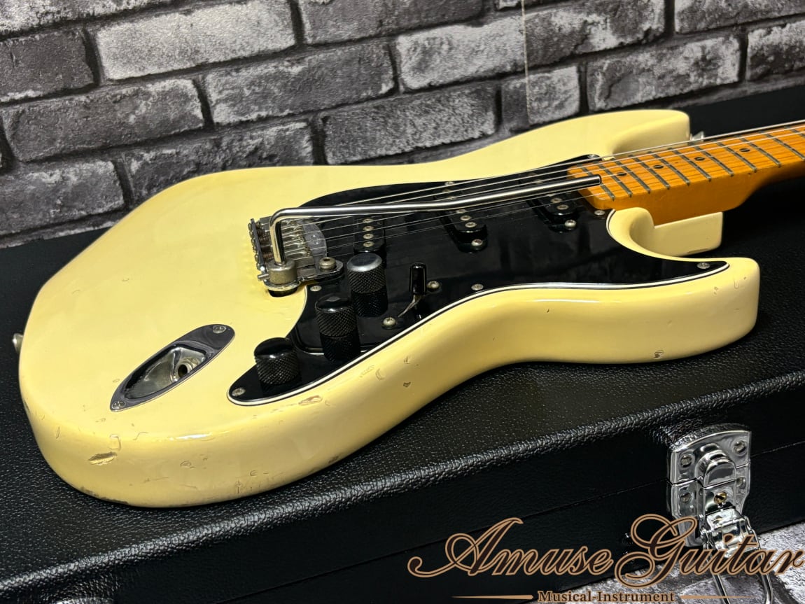 こちらの状態ですが、36年の歳月が経過した年式相応の打痕、スレ、金属パーツの使用感がございます。しかしながら演奏面に支障のある個所は無く、使用感自体も変に激しいものではなく、ヴィンテージギターとしての空気感を纏ったオーラを放ちます。ネック状態はトラスの余裕をしっかりと確認済みで、フレットはすり合わせ処理済みの残り山約5割程となります。付属品につきましてはアーム、ソフトケースです。※ハードケースは撮影用のものです。