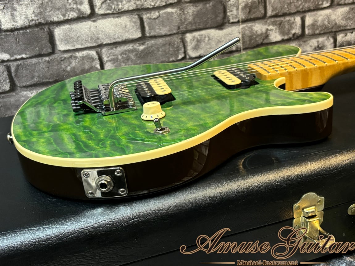 まずその仕様としましては、杢目の深いフレイムメイプルトップに杢目を生かすグロス仕上げのシースルーグリーンフィニッシュ。ボディバックにはバスウッド、ネックにはバーズアイとフレイムの混在するフィギュアドの貼りメイプルネック、ヘッドはボディトップ同様のマッチングヘッドスタイル。22フレット(ミディアムジャンボ)、41mmナット、10R、ロングスケールの5点止めボルトオン構造。ボディバックにはEVHモデルでも採用されていた”Chocolate Brown”カラーを採用。その他としてはブラスブロックのフロイドローズトレモロ(MUSIC MANオリジナル)&ロックナット、1ヴォリュームのコントロール(ノブはTONE)、シャーラーペグチューナー&パールボタン、独自のヒールレス加工、コンター加工などが挙げられます。