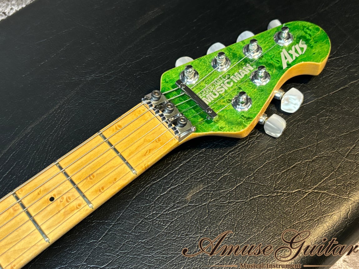 今回ご紹介させていただきますのは、そのミュージックマン社定番であるAXISのリミテッドモデルです。Eddie Van Halenシグネイチャーモデルの Music Man EVHの販売終了後、その後継機としてリリースされたAXIS。その独自の使用感やサウンドが今なお広く愛されております。本機はそのAXISが1991年に誕生してから20周年を記念し製作されたモデルとなり、厳選された極上の木材を使用し製作されました。9色の鮮やかなカラーを各色極少数のみ生産し、その中でも特段中古市場に現れないグリーンフィニッシュとなります。