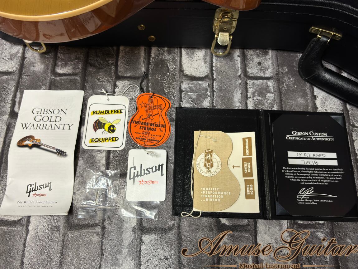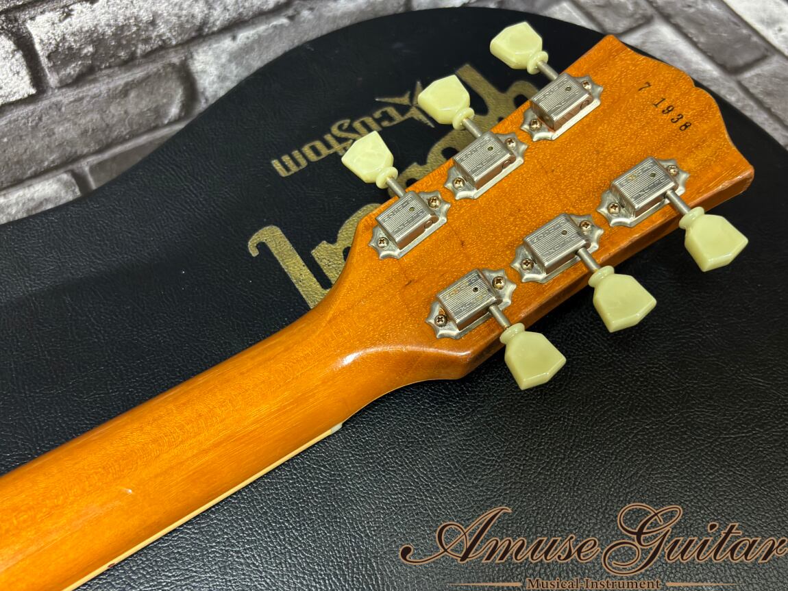 最後に状態としてはエイジド品という事もあり判断は難しいながらも、こちら加工以外に後付けとなるダメージは見受けられません。併せまして、同年代同仕様品がデジマートにて美品表記で販売されている個体よりも後付けと思われるダメージが見受けられないので、工場出荷時からの使用感も少ないと判断。パーツや電装内部もフルオリジナルです。プレイ面としてもネックコンディションは良好でトラスの余裕もシッカリと残っており、フレット目立つ凹みは無く70%以上残っております。付属品についても認定書を始めとする新品購入時の一式が揃っており(画像参照)、ケースも勿論オリジナルのハードケースです。