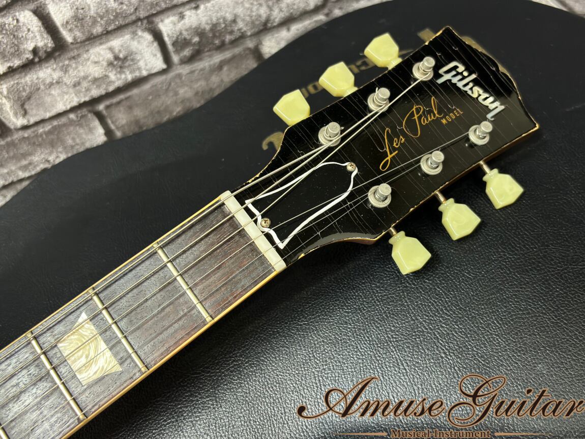 まずそのスペックとして、採用された材はHistoric Collectionシリーズならではの厳選された良質材にて、ボディにはメイプルトップ&マホガニーバック、マホガニーネック&ローズウッド指板の王道のウッドマテリアルにて構成され、総重量も約4.06kgと軽量な個体となっております。フィニッシュカラーにはヴィンテージの風合いを感じさせるAntique Goldカラーをトップに、ボディバックは人気のナチュラル仕様。指板のコントラストも強く、強い黒の杢目はハカランダを彷彿とさせる素晴らしい材となっております。またその他として、ロングテノン・ディープジョイント、ハイドグルー(ニカワ)接着、”7”から始まるヴィンテージスタイルのシリアル、ヘッドロゴもヴィンテージ個体の様な若干下部に寄った位置、ヴィンテージ同様となるトラスロッドカバースタイル、ネックシェイプは57モデル然とした握り心地の良いグリップ感で、鳴りを減衰させない図太いサウンドの秘密もここに有りという仕上がり。ABR-1のチューンOマティック、Gibson Deluxe刻印の1コブクルーソンチューナー、コールドバレルノブ等が挙げられます。パーツ類もエイジングゴールドトップの風合いにマッチするエイジド仕様にて、比較的近年の製作品ながらに貫禄のオーラを持つ一本に仕上げられております。