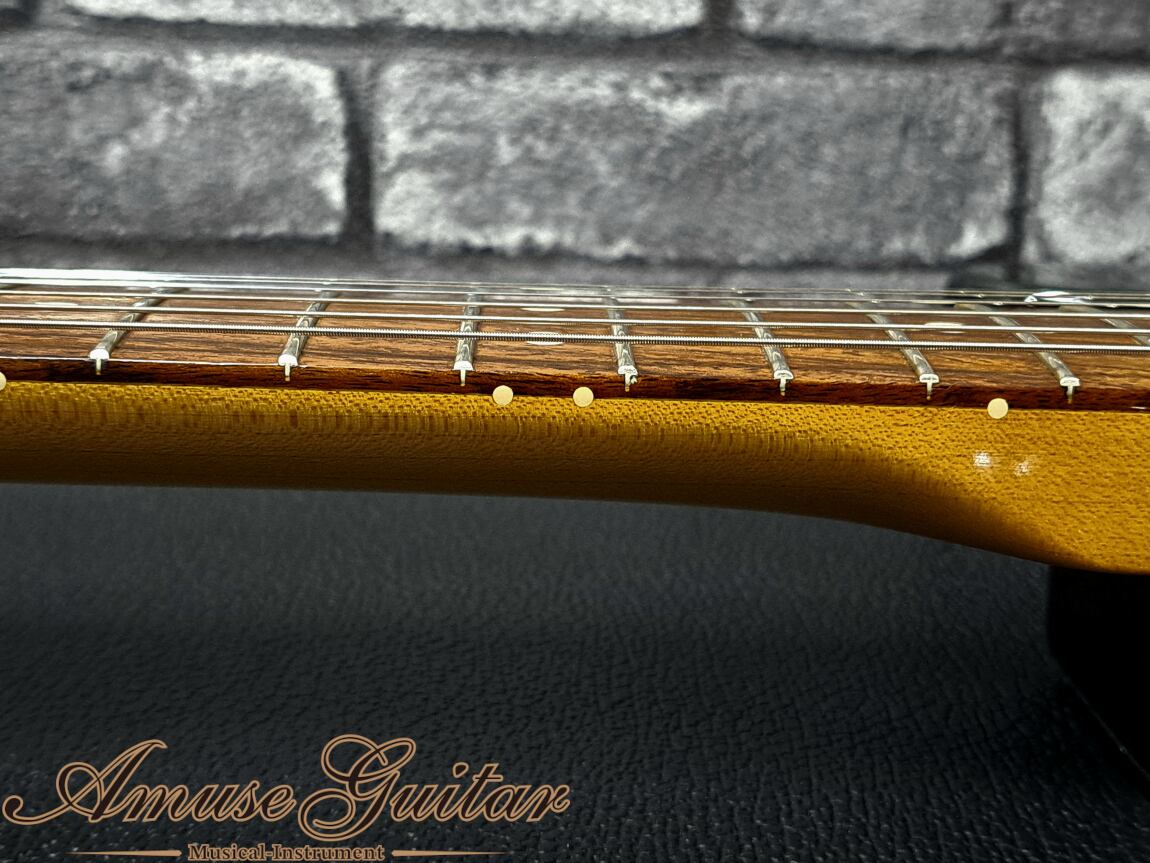 こちらのスペックですが、アルダーボディに、板目取りメイプルに、ローズウッド指板を採用した木材マテリアル。ロングスケール、21フレット、41.5mmナット、7.25R、太すぎないUシェイプネックの三点止め(withマイクロティルト)ボルトオン構造。シャーラー製のFキーペグ。ブリッジにはアルミサドルの3wayテレキャスタータイプ。コントロールは時代背景を取り入れたレスポールに近しい使用で、3wayピックアップセレクター/2ヴォリューム/2トーン。ボディ全体を覆う黒-白-黒の3プライピックガード、ノブはフェンダーアンプ等でも多く見受けられるソンブレロノブ。その他としましてはストラップピンがシャーラーロック対応の物に換装されております。