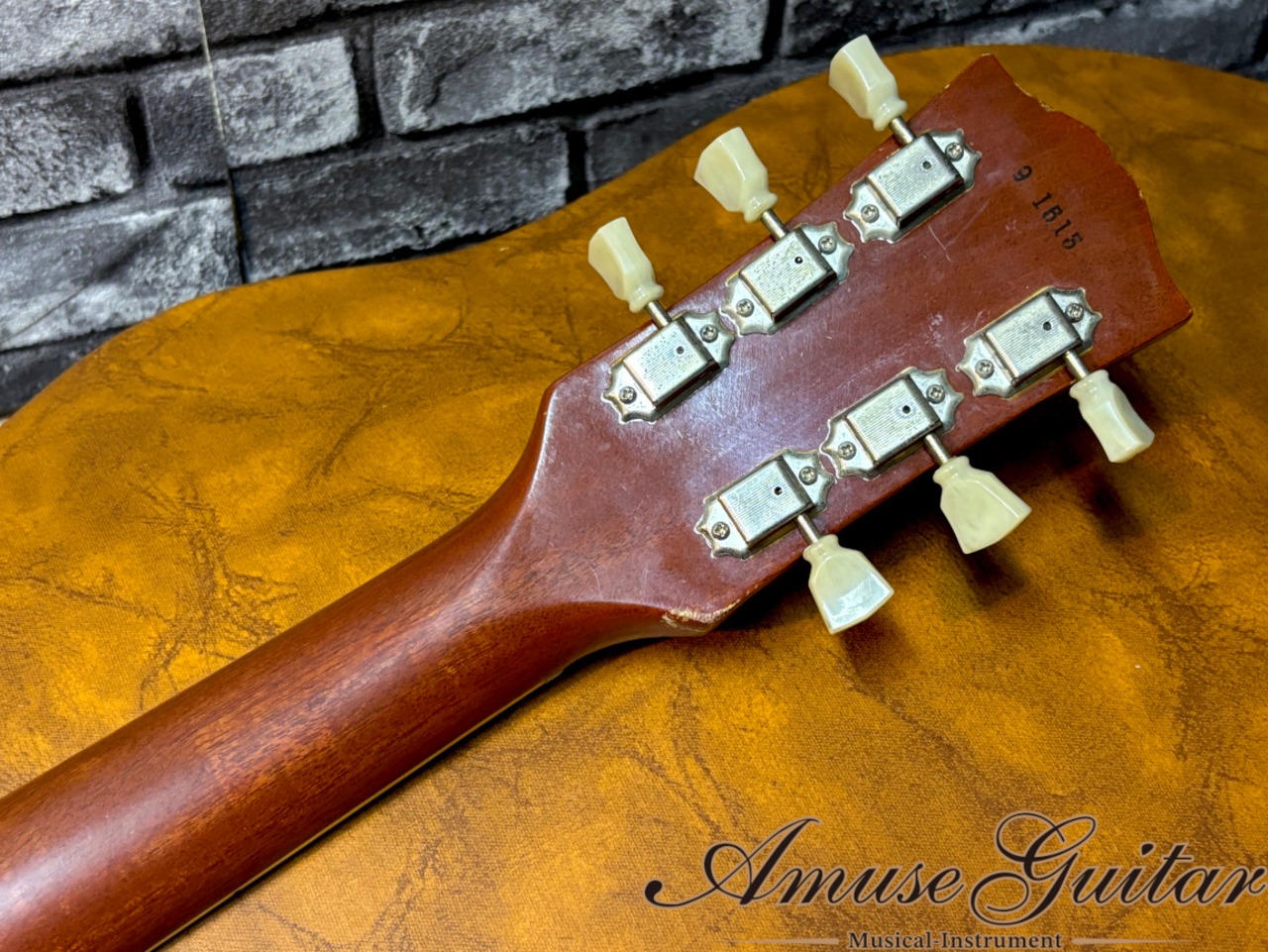 そして本機最大の特徴の一つとして、各部がDMC Partsにアップグレード換装されている点となります。現在では生産されておらず、個人取引でも高騰を極め入手困難が加速するアイテムとなりますが、こちら殆どのパーツをDMCに載せ替えた驚愕のカスタム。当該箇所はトラスロッドカバー、ペグボタン(DTT)、ペグポストブッシュ(Vintage Slant bush)、ピックアップカバー(Super Real PAFF)、エスカッション(M69 Pickup Rings)、ピックガード、ピックガードブラケット(Crazy Bracket)、ノンワイヤーABRブリッジ(NWB-1)、スタッド(Iron ClawS)、テイルピース(Vintage Hot Tail)、サムナット(Spinnig thin Saucer)、ノブ(Hat Top Trick Knobs)、ノブポインター(Pointed Brothers)、セレクターリング/プレート(Wild Ring)、セレクターチップ(Burst Brown Tip)、ジャックプレート(Jumping Jack Plate)。金属パーツは金型からおこし、入手できない素材は一から製作、当時オリジナルパーツ製作元をヨーロッパまで訪ね素材を分けてもらい製作するなど、通常のレリックパーツのレベルを遥かに超えたクオリティです。