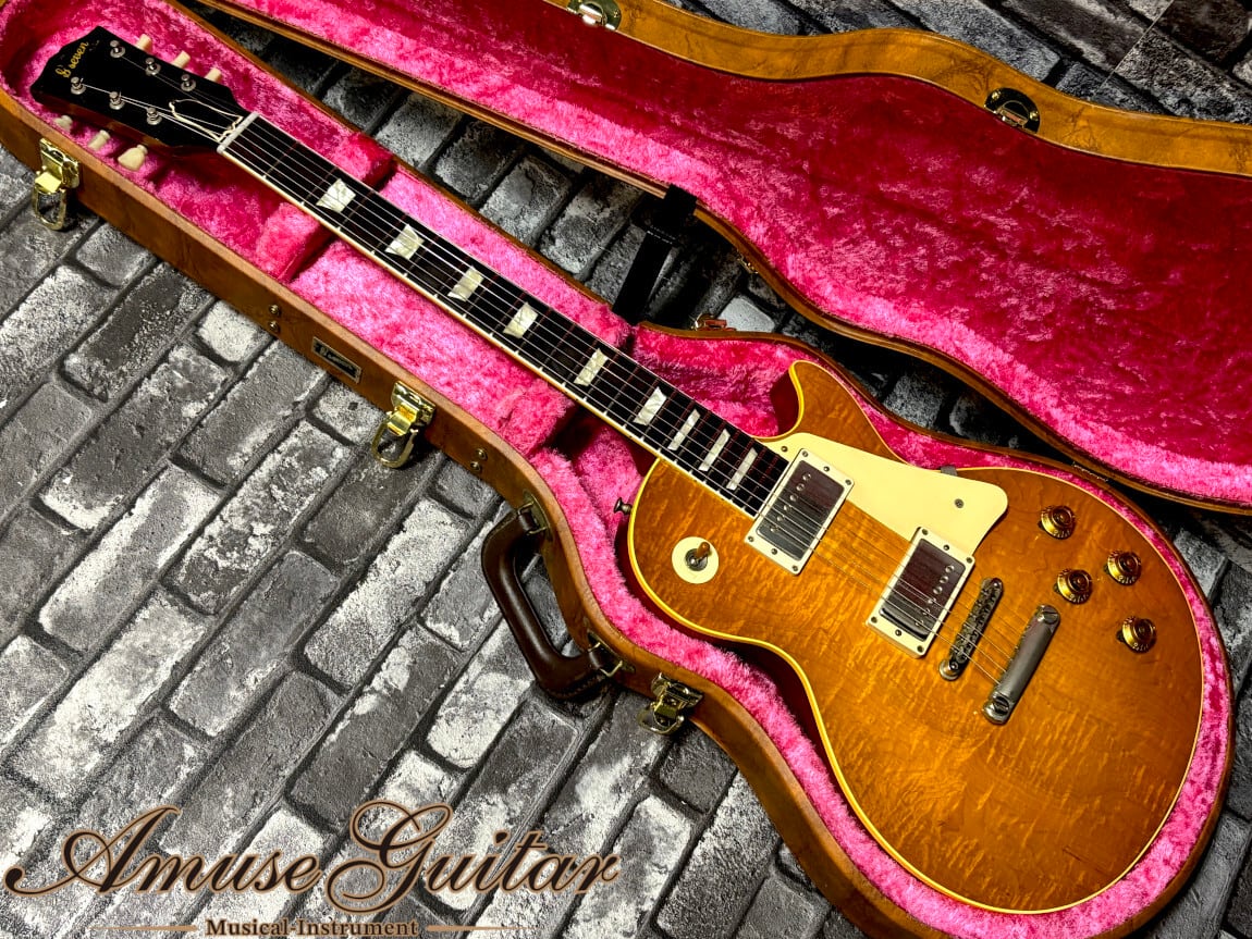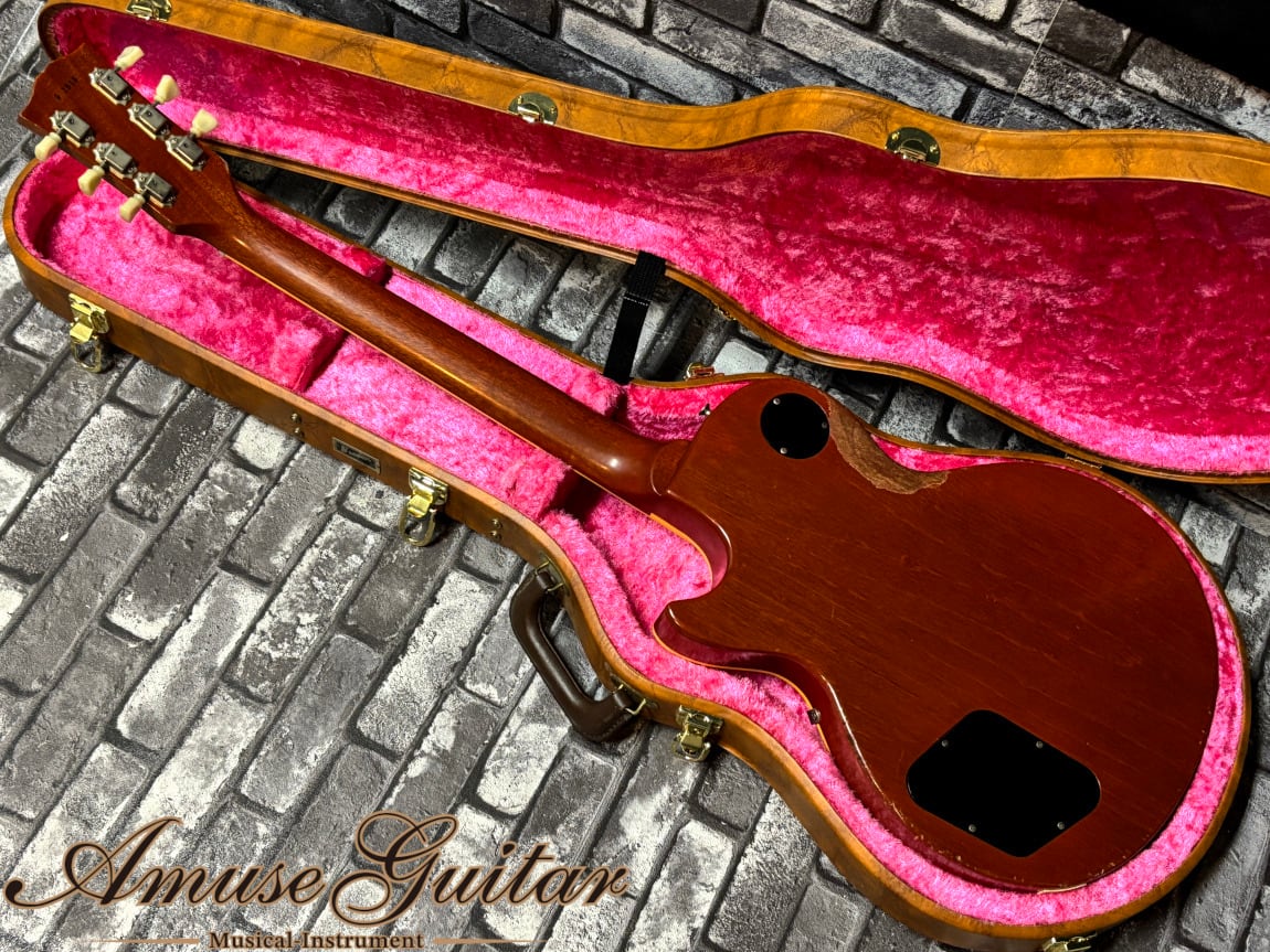 こちらのスペックですが、木材マテリアルに関しては極上の材が採用されており、まず目に飛び込んでくるヴィンテージの様に黒々とした色味と共に”うねる”導管も確認できるハカランダ(ブラジリアンローズウッド)指板。ネックにはホンジュラスマホガニー。ボディバックにも同じくホンジュラスマホガニーを贅沢に1Pにて採用。そしてボディトップには4Aグレードのハードメイプルを採用にて圧倒的な存在感と、サウンドにも恩恵を与える選定された材です。ハニーカラーにてフィニッシュされたボディも、ヴィンテージのようにフェイドしたかのような調色となっており、全体の雰囲気も相まって本家リイシューをも上回るオーラと高級感を放ちます。その他はLP然とスペックを踏襲し、精度抜群のジョイント部もディープジョイント方式を採用したセットネック構造となっております。