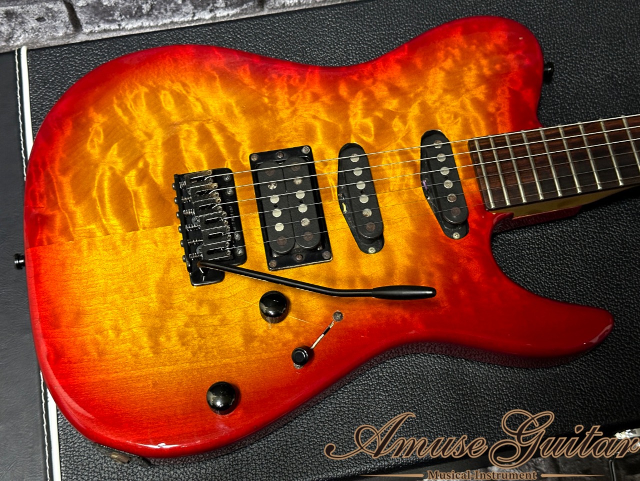 まずそのスペックとしては、深く表情のある3Dの様なフィギュアドメイプルを贅沢にも2Pにてボディ全体に使用。フィニッシュには色鮮やかなチェリーサンバーストをグロス仕上げにて採用。ネックは追い柾目の木取りにてメイプル、ローズウッドをスラブ貼りにて指板に採用。そのネックはオイルフィニッシュ仕上げ。ポジションマークはサイドのみで指板上には入れられておりません。”A”ロゴ入りのオリジナルペグ。ナット(41mm)は珍しいニッケルシルバー素材で開放弦の発音や、サスティーンも優れています。ブリッジにはトム・アンダーソンオリジナルデザインの4点支持となるシンクロナイズドトレモロを搭載。そしてヘッドのブランドロゴには、当時トム・アンダーソンとコラボレートしていた輸入代理店ムーン・コーポレーションのオリジナルデザインロゴが採用されております。