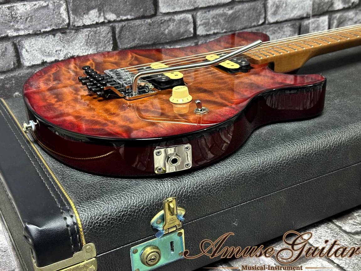 まずその仕様としましては、ボディトップには深い3Dの様なフィギュアドキルトに杢目を生かすグロス仕上げのオータムアンバーカラー。ボディバックにはバスウッド、ネックにはフレイムフィギュアドが美しい貼りローステッドメイプルネック、ヘッドにもばっちりとフレイム杢目が輝きます。22フレット(ミディアムジャンボステンレス)、約41mmナット、10R、ロングスケールの5点止めボルトオン構造。その他としてはブラスブロックのフロイドローズトレモロ(MUSIC MANオリジナル)&ロックナット、1ヴォリュームのコントロール、シャーラーペグチューナー&パールボタン、独自のヒールレス加工、コンター加工などが挙げられます。