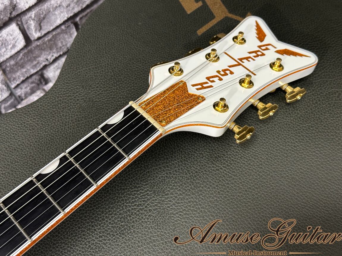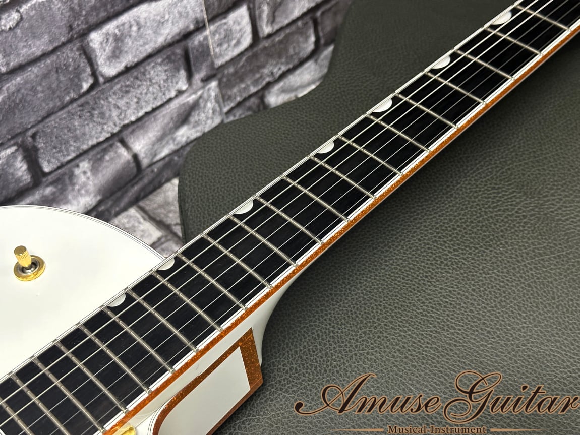 まずスペックとしては、17インチ幅&シングルカッタウェイの定番ファルコンスタイルで、アーチドトップのボディにはラミネーテッドメイプルを採用し、2-1/4インチボディ厚&トレッスル・ブレーシング仕様。グロスホワイトと、ゴールドスパークルバインディング&トラスカバーを組み合わせ、ゴージャスでエレガントなルックスは、世界一美しいギターと称される事にも納得します。メイプルネックには真っ黒なエボニーフィンガーボードを採用し、ポジションマークはネオクラシック・サムネイルが使われております。その他としては、ファルコンヘッドのゴールド・スパークルのヴァーティカルロゴ、ロッキング・バーブリッジとブリッジのズレを防止するピンド・エボニー・ベース、グレッチロゴ&ファルコンのグラフィックの入ったゴールドピックガード、ジュエルド・アローのコントロールノブ、GRETSCHロゴ入りのB6CPビグスビーユニット(ストリングスルータイプ)、ダイヤルロック式のグローバー製インペリアルロッキングチューナーなどが挙げられます。