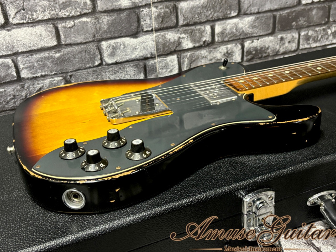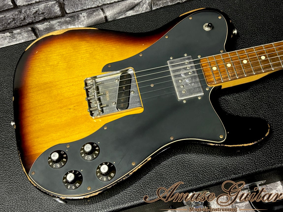 今回ご紹介させていただきますのは、そのテレキャスターカスタム。フェンダーメキシコの工場にて製作された一本で、内部アッセンブリーはUSA基準にて組み込まれておりサウンドのクオリティも非常に高く、エイジングも施された”ロードウォーン”シリーズとなり、コストパフォーマンスの優れたスペックが人気で中古市場でも即売が多く見受けられるモデルです。加えて、今回のテレキャスターカスタム(3CS)は日本には限定50本のみ入荷した大変珍しいモデルとなります。